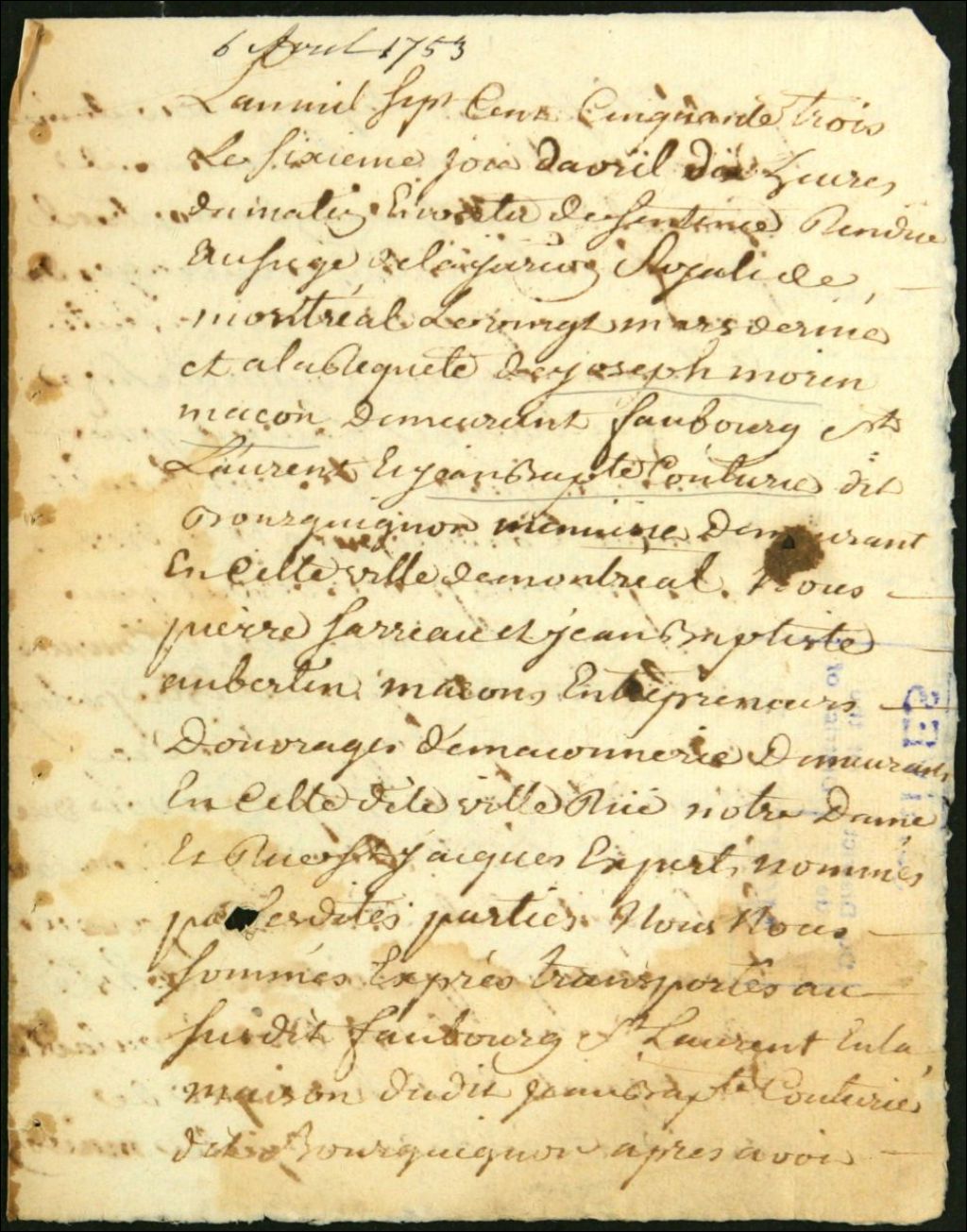 - Ce dossier de matière civile est composé du rapport des experts Pierre Sarault et Jean-Baptiste Aubertin, entrepreneur maçon, disant que les travaux entrepris par Joseph Morin dans la maison de Jean-Baptiste Couturier dit Bourguignon située au faubourg Saint-Laurent, sont bien faits