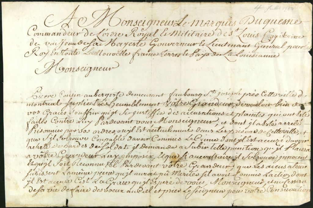 - Ce dossier de matière civile est composé des pièces suivantes : les rapports d'assignation servie à Thomas Giroux à la requête de Pierre Cousin pour payer la somme de 11 livres et 18 sols pour boissons ; la transcription d'un extrait des registres d'audience d'une sentence qui ordonne la comparution de Thomas Giroux en personne pour répondre à la demande de l'aubergiste Cousin ; et la note de frais pour les boissons de Giroux qui se trouve à l'endos d'une requête de Pierre Cousin, adressée au marquis Duquesne qui l'aurait fait emprisonner pour avoir acheté les hardes d'un soldat. Catherine Massé est mentionné comme procuratrice dans cette affaire