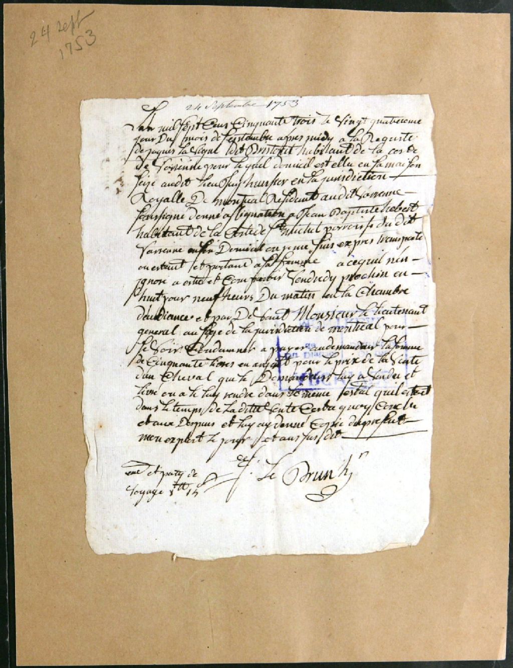Procès entre Jean-Baptiste Hébert, habitant de Côte-Saint-Michel, demandeur, et Jacques Brisetout dit Lavigne, défendeur, pour le payement d'un cheval, 24 septembre 1753, Archives nationales à Montréal, Fonds Juridiction royale de Montréal, (06M,TL4,S1,D5835).