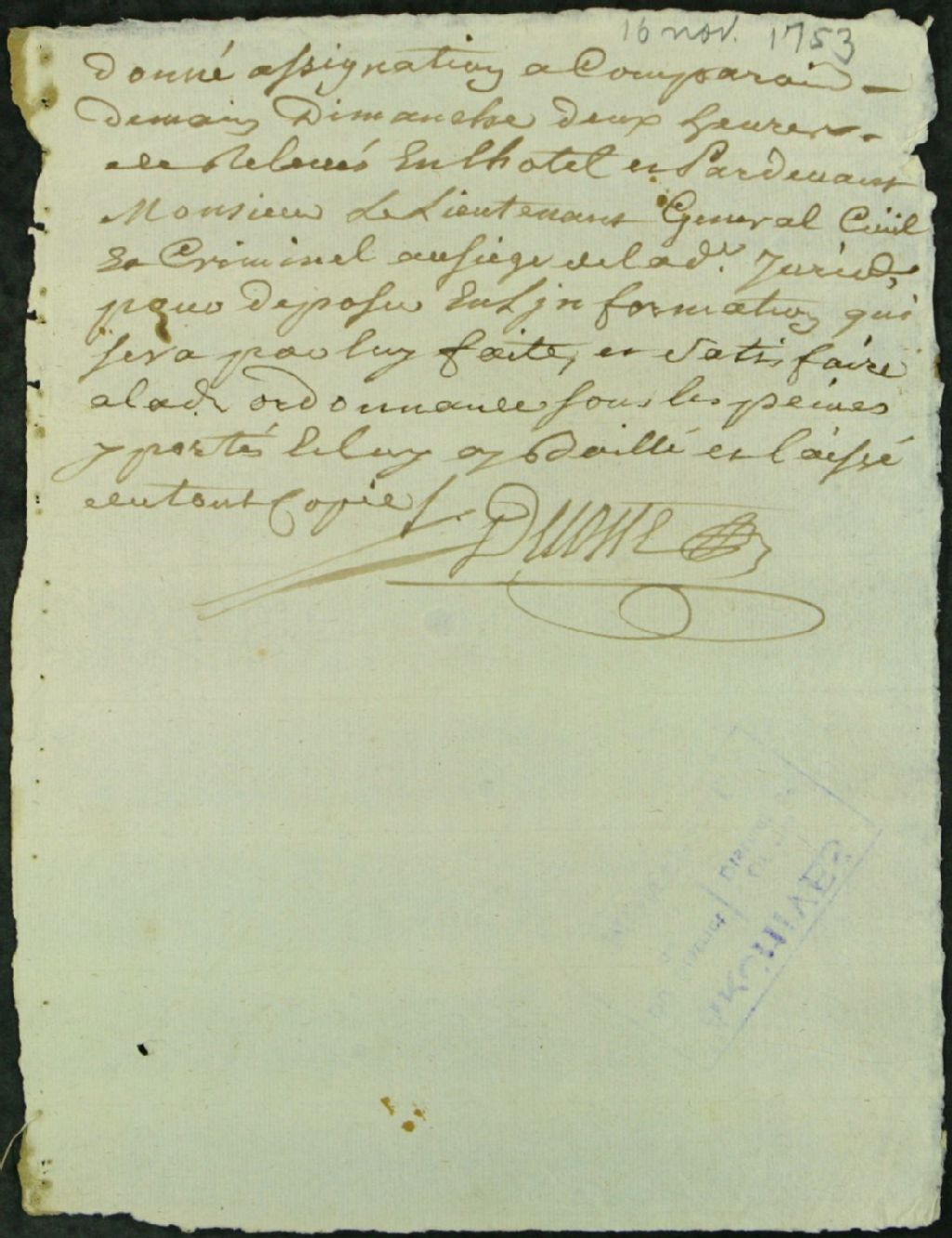 Ce dossier de matière criminelle est composé des pièces suivantes : la transcription d'un décret de prise de corps contre Françoise Duval dit Vinaigre, accusée d'avoir volé 255 livres dans le portefeuille du capitaine Charles Nadeau, de la barque " le Saint-Jean ", ancrée au port de cette ville ; l'ordre pour faire assigner les témoins du procureur du roi ; les rapports des assignations ; la transcription du décret l'emprisonnement ; la signification à la femme Bellerose ; le procès-verbal des recherches faites par l'huissier Christophe Decoste accompagné de Jolibois, caporal de la garnison, de quatre mousquetaires et de Claude Labonté ; l'interrogatoire de Bellerose et de la veuve Vinaigre ; la réquisitoire pour le prononcé d'un défaut contre le témoin et frère récollet Claude Cliche dit Didace, 43 ans, non comparant à l'assignation ; l'ordonnance de réassigner avec ordre à Carpentier, supérieur des Récollets, de faire comparaître le frère Didace, sous peine de suspension des privilèges royaux ; et l'information judiciaire où le frère Didace affirme qu'une inconnue lui a remis un papier contenant de l'argent et des ordonnances, pour les remettre au capitaine Nadeau.Le dossier contient également : l'ordre d'assignation aux témoins pour le récolement des témoignages ; lesdits récolements ; les requêtes pour assigner la femme Bellerose par un cri public et déclarer la contumace contre elle ; l'accord et la publication qui s¿en suivent ; la sentence qui déclare la contumace bien instruite et déclare l¿accusée convaincue d'avoir volé 255 livres pour lequel crime elle est condamnée à être pendue et étranglée ; les procès-verbaux de la capture de la femme Bellerose par l'huissier Jean-Baptiste Decoste, accompagné de son fils Christophe et de l¿écrou de la dame ; l'interrogatoire de celle-ci, laquelle s'était sauvée à Saint-François ; le requête du procureur du roi pour la confrontation des témoins et l¿accusée ; l'ordre de publication pour assigner les témoins absents depuis l'événement de 1753 ; les procès-verbaux des confrontations de la femme Bellerose avec les témoignages des témoins absents, dont celui d¿André Chartrain, 19 ans, charretier du Faubourg Saint-Martin, lequel la reconnaît comme étant la personne qui a volé l'argent à bord de la barque de Nadeau ; l'interrogatoire de l'accusée sur la sellette en présence des assesseurs et notaires Bouron, Simonnet, Gervais Hodiesne et Jean-Baptiste Adhémar ; la sentence qui condamne la femme Bellerose à être battue et fustigée, flétrie et bannie de la ville à perpétuité ; l'appel de sentence par le procureur du roi ; et l'ordre de transfert à Québec. Jean Samson, charretier, 29 ans, et André Guy, 18 ans, sont des témoins et des matelots du Saint-Jean que les documents mentionnent