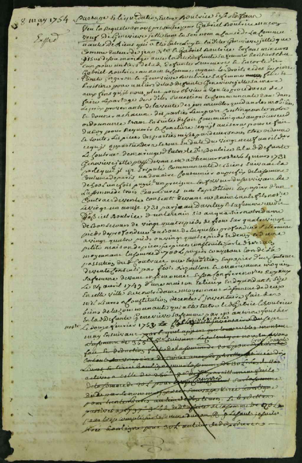 Partage des biens de feu Geneviève Jetté, épouse de Gabriel Bourhis, 8 mai 1754, Archives nationales à Montréal, Fonds Juridiction royale de Montréal, (06M,TL4,S1,D5883).