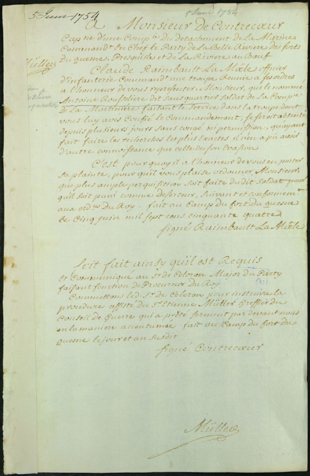 - Ce dossier de matière criminelle se compose des pièces suivantes : la transcription faite par Étienne Müller, greffier du Conseil de guerre, au fort Duquesne, d'une plainte de Claude Raimbault La Moelle, officier, adressée à de Contrecoeur, capitaine et commandant du détachement dudit fort, pour faire rechercher et juger le soldat Antoine Rousselière dit Sanscartier, absent depuis plus de 24 heures, et présumé avoir déserté ; la permission de faire rechercher et de tenir un procès sous la direction de Pierre-Joseph Celoron de Blainville, fils, commis major ; le procès-verbal des recherches faites par Antoine Lemaire dit Laramée, sergent de la compagnie de Sabrevois, 36 ans, officier enquêteur ; la requête de Celoron pour la tenue d'un procès par contumace ; l'information sous la direction de Celoron ; l'ordre de celui-ci pour le récolement des témoignages ; le procès-verbal dudit récolement ; les conclusions de Celoron agissant comme [...]