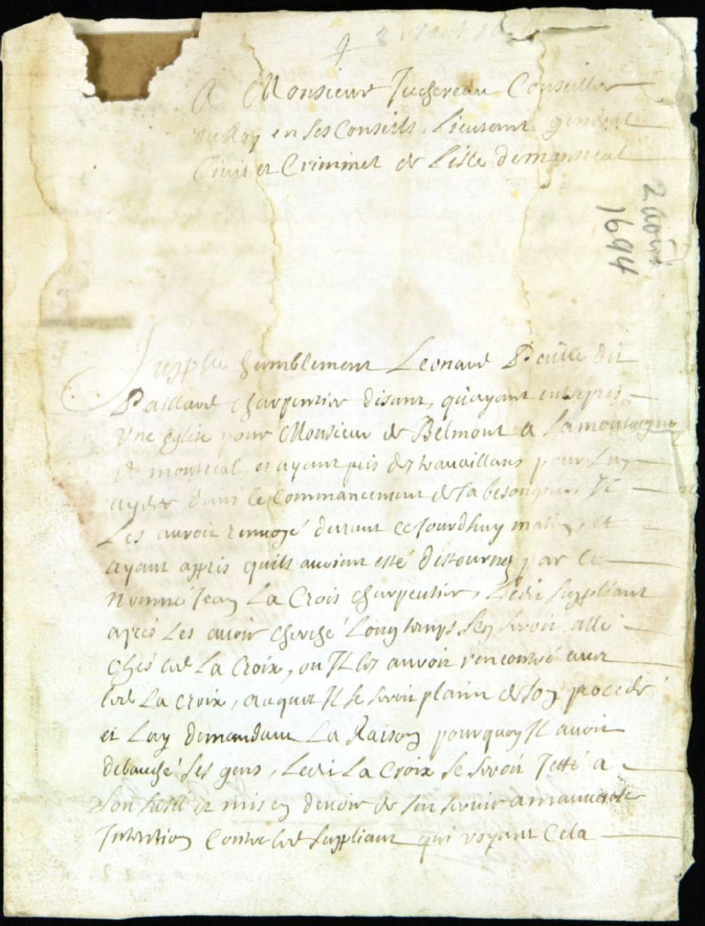 Procès entre Léonard Paillé dit Paillard, charpentier, plaignant, et Jean Lacroix, charpentier, accusé de voies de fait, 2 août 1694 - 9 août 1694, Archives nationales à Montréal, Fonds Juridiction royale de Montréal, (06M,TL4,S1,D59).