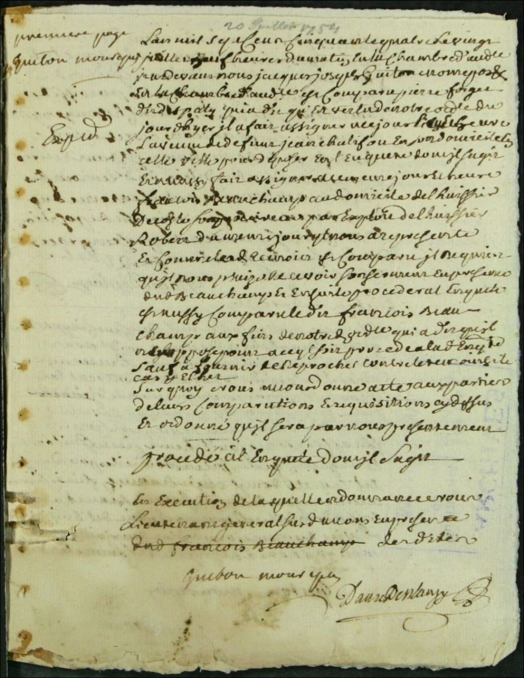 - Ce dossier de matière civile se compose des pièces suivantes : le procès-verbal d'enquête pour Pierre Forget dit Despati, contre François Beauchamp, qu'il accuse d'avoir maltraité et blessé sa femme alors qu'elle tentait de lui remettre l'enfant dont la nommée Guibord avait accouchée, selon les instructions du procureur du roi à cet effet ; l'enquête au cours de laquelle Marie-Anne Boesmé, veuve de Chalifou et épouse de Louis Guibord, déclare qu'elle accompagnait la femme de Forget, sage-femme, lorsque cette dernière, à la requête du procureur du roi, a rencontré François Beauchamp pour lui remettre l'enfant qu'il a fait à la nommée Guibord et que ce dernier a refusé de prendre l'enfant et de plus a maltraité et frappé ladite sage-femme laquelle a dû aller se faire soigner par le chirurgien Vignau ; les procès-verbaux d'enquête pour les deux parties ; et les deux enquête pour les témoins de chacune de ces dernières. Les témoins sont [...]