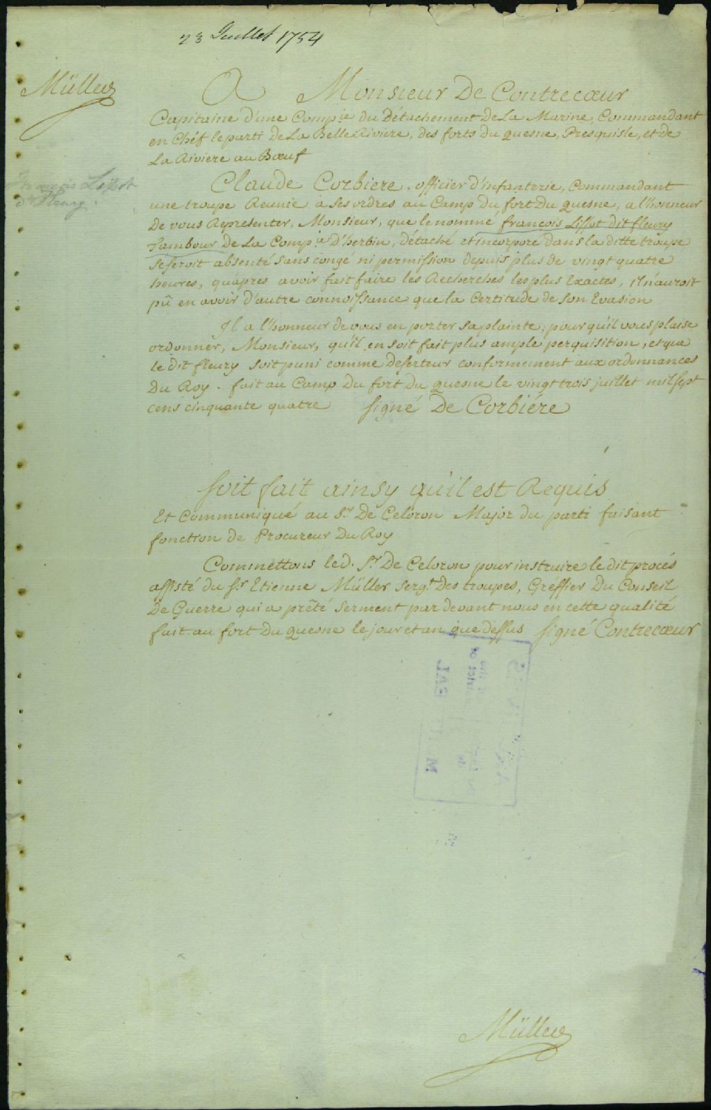 - Ce dossier de matière criminelle se compose des pièces suivantes : la transcription faite par Étienne Müller, greffier du Conseil de guerre, au fort Duquesne, d'une plainte de Claude Corbière, officier d'infanterie, adressée à de Pécaudy de Contrecoeur, capitaine et commandant du détachement dudit fort, pour faire rechercher et juger François Lissot dit Fleury, tambour de la compagnie de Herbin, absent depuis plus de 24 heures, et présumé avoir déserté ; la permission de faire rechercher et de tenir un procès sous la direction de Pierre-Joseph Celoron de Blainville, fils, commis major ; le procès-verbal des recherches faites par Daniel Bourguignon, sergent de la compagnie de Sabrevois, âgé 50 ans ; la requête de Celoron pour la tenue d'un procès par contumace ; l'information sous la direction de Celoron ; l'ordre de celui-ci pour le récolement des témoignages ; le procès-verbal dudit récolement, dont celui de Joseph Lafleur dit [...]