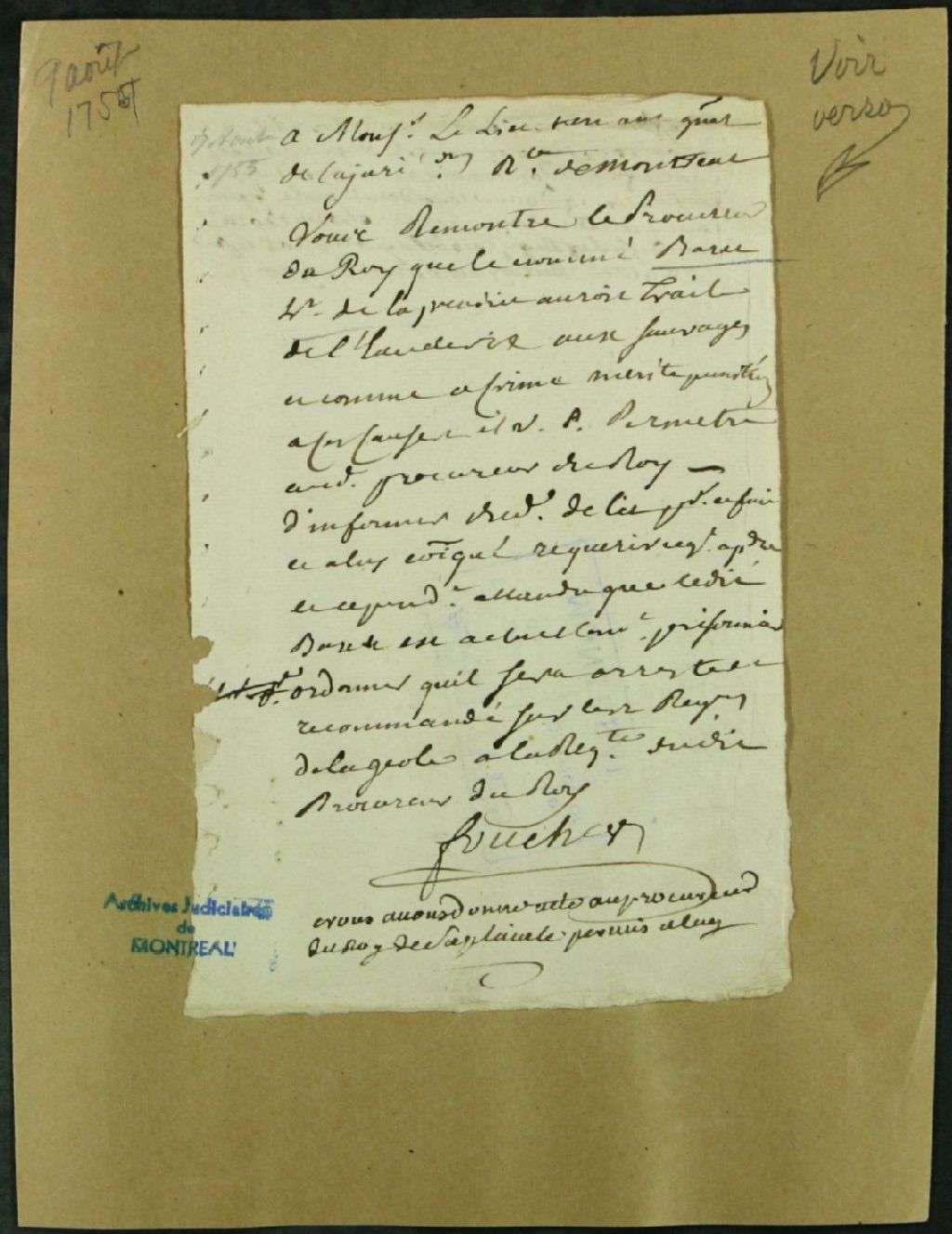 - Ce dossier de matière criminelle se compose des pièces suivantes : le requête pour la tenue d'une information judiciaire contre Jean Baret, 46 ans, prisonnier, accusé d'avoir vendu de l'eau de vie aux sauvages ; la permission d'informer ; le procès-verbal de l'interrogatoire de Baret, lequel avoue avoir vendu à l'occasion de la boisson aux sauvages ; les conclusions du procureur du roi ; la sentence qui condamne Baret à 150 livres d'amende applicable aux pauvres de l'Hôpital général ; et la signification