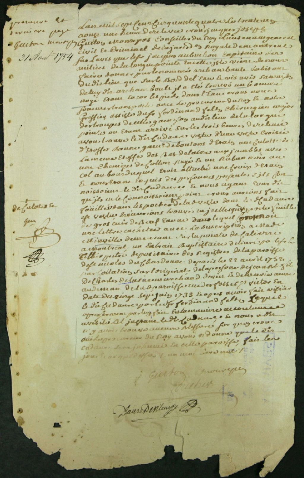 Constat du décès et permis d'inhumer Jean-Baptiste Lasne, fils de Charles et Marie Audemant, mort noyé, 31 août 1754, Archives nationales à Montréal, Fonds Juridiction royale de Montréal, (06M,TL4,S1,D5917).