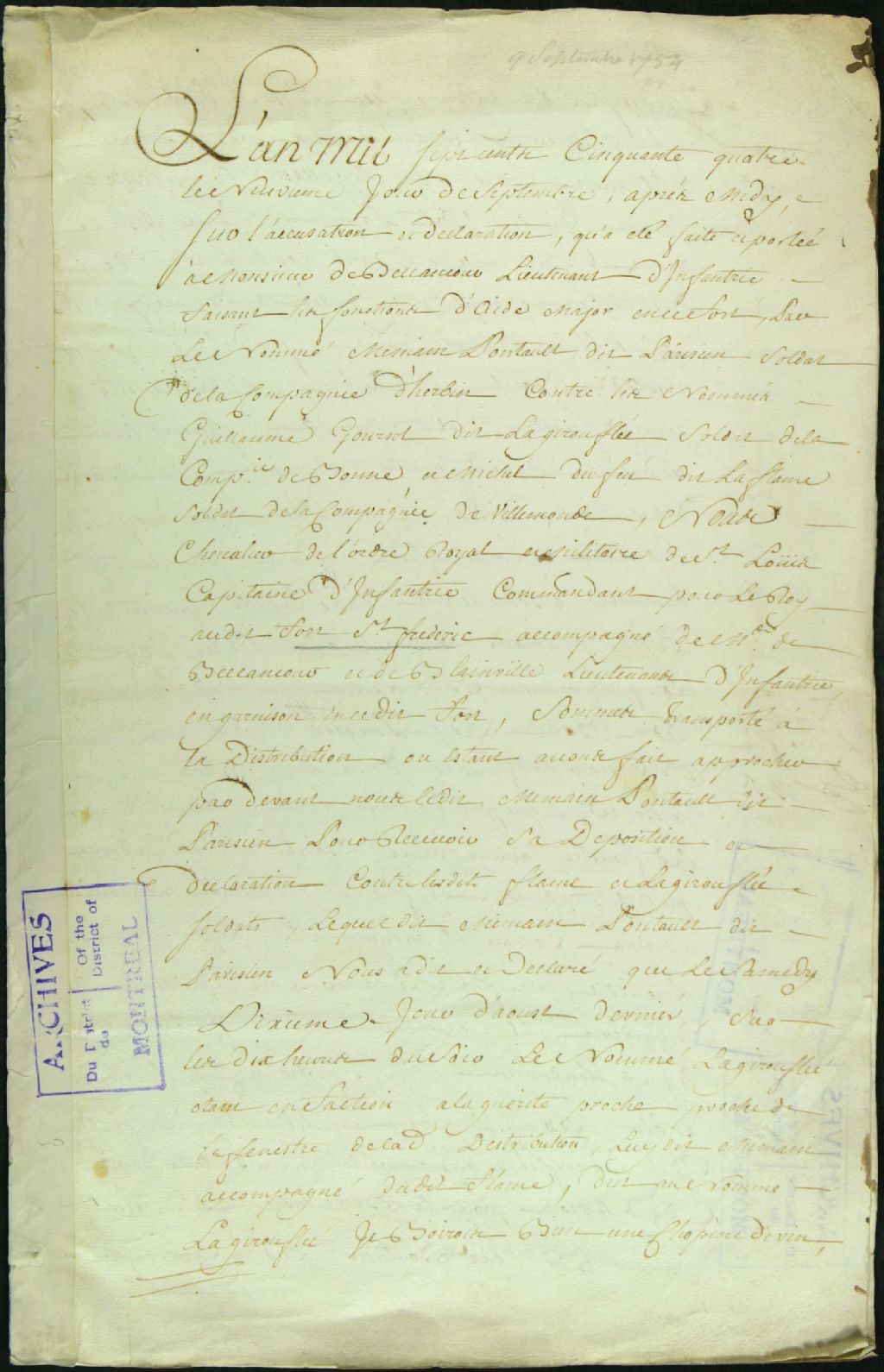 Procès contre Menin Pouteau dit Parisien, sculpteur, soldat d'Herbin, Michel Dufeu dit Flame, soldat de la Compagnie de Villemonde, et Guillaume Goursol dit Lagiroflée, soldat de la Compagnie Debonne, accusés de vols dans la chambre de distribution du fort Saint-Frédéric, 9 septembre 1754 - 26 février 1755, Archives nationales à Montréal, Fonds Juridiction royale de Montréal, (06M,TL4,S1,D5921).