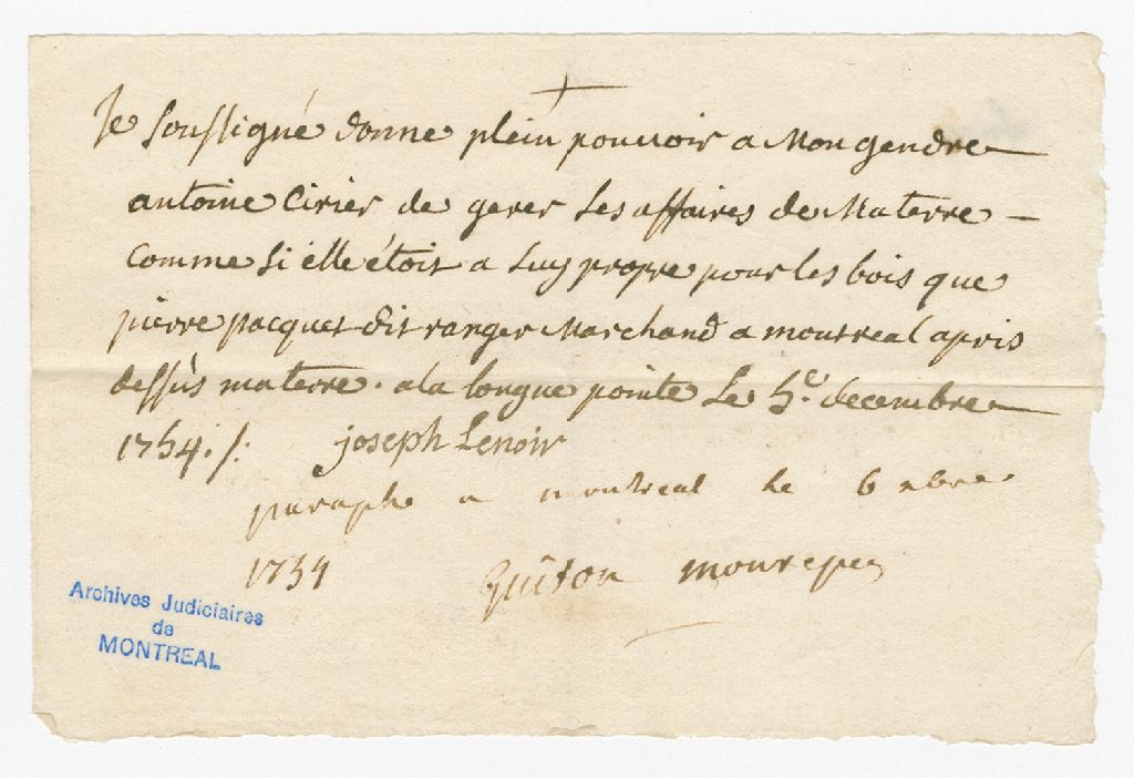 Procès de Joseph Lenoir, demandeur et Pierre Paquet dit Ranger, marchand, défendeur, 6 décembre 1754, Archives nationales à Montréal, Fonds Juridiction royale de Montréal, (06M,TL4,S1,D5933A).