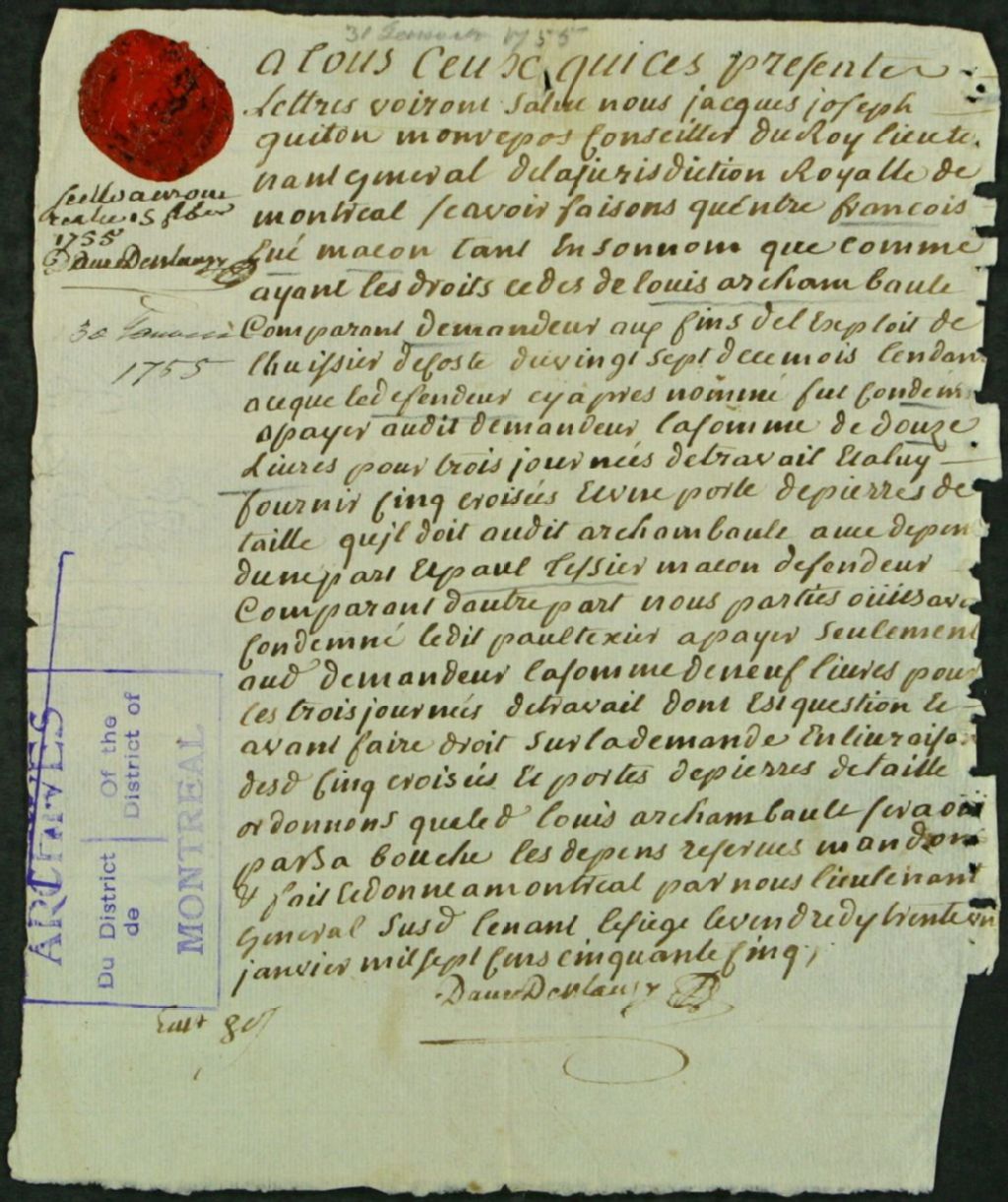Procès entre François Hévé, maçon, demandeur, et Paul Tessier, maçon, défendeur, pour le payement de salaires et de travaux, 31 janvier 1755, Archives nationales à Montréal, Fonds Juridiction royale de Montréal, (06M,TL4,S1,D5957).