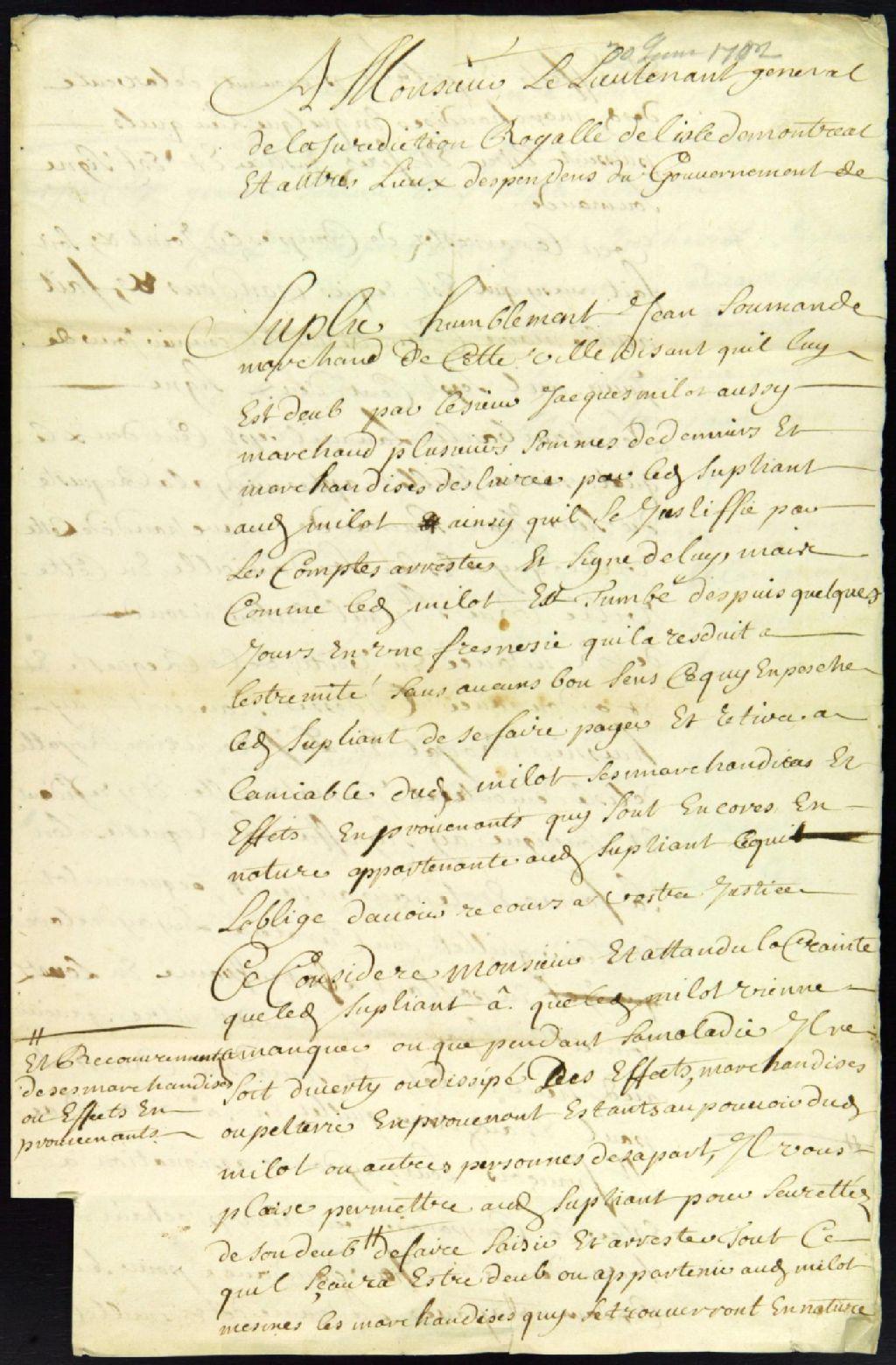 - Ce dossier de matière civile contient la requête de Jean Soumande, affirmant que Jacques Milot lui doit plusieurs sommes et marchandises, mais étant donné la maladie de Milot et qu'il " est tombé depuis quelques jours dans une frénésie qui l'a réduit à l'extrémité sans aucun bon sens ", il requiert, pour plus de sécurité, de faire saisir les biens du défendeur jusqu'à concurrence des sommes qui lui sont dues ; la permission est accordée.Le dossier comprend aussi la signification du jugement à Milot et à son curateur, Guillet et la saisie du blé et des bestiaux appartenant à Milot, chez Nicolas Boyer