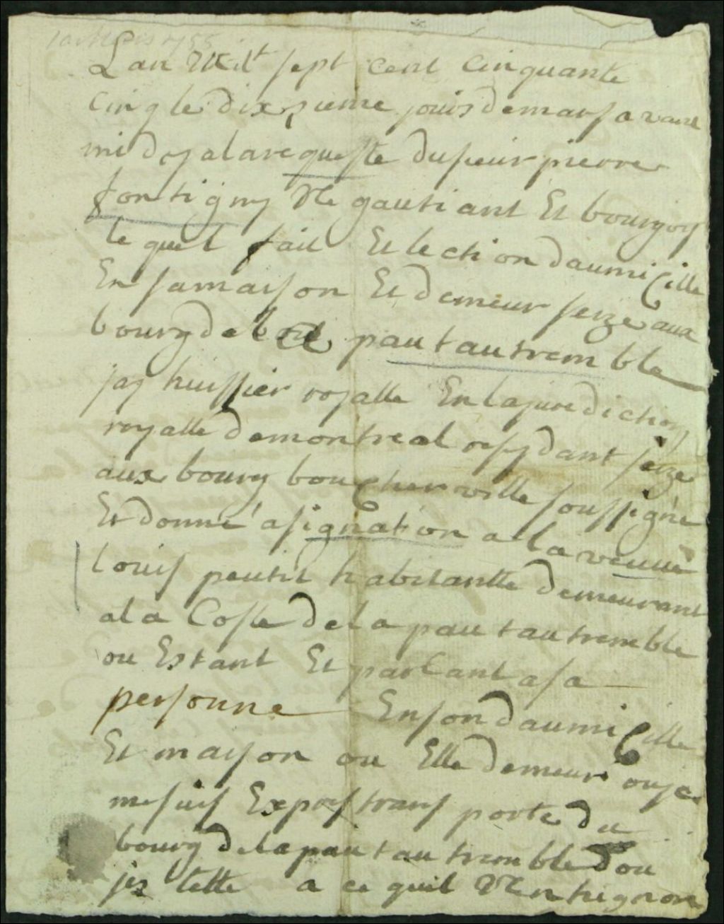 - Procès entre Pierre Fontigny dit St-Jean, négociant de Pointe-aux-Trembles, demandeur, et la veuve et les enfants de Louis Petit, défendeurs, pour paiement de comptes