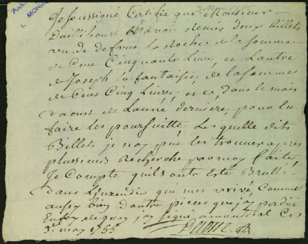 - Certificat de Jean-Baptiste Decoste, huissier, à l'effet qu'il a pedu deux billets appartenant au sieur d'Ailleboust
