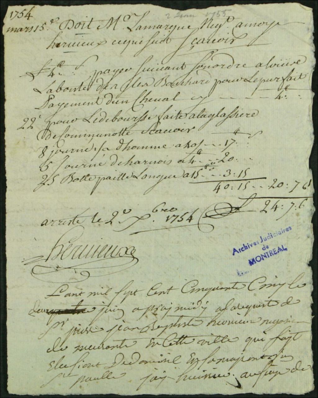- Ce dossier de matière civile se compose du rapport de la signification d'un compte arrêté le 2 décembre 1754 et de l'assignation à comparaître servie à Pierre Panet, en sa qualité de curateur de la succession vacante de Charles Nolan Lamarque, pour payer le montant de 24 livres 7 sols et 6 deniers à la requête de Pierre Jean- Baptiste Hervieux. On cite également Louise Labonté, des îles Bouchard, dans ce document