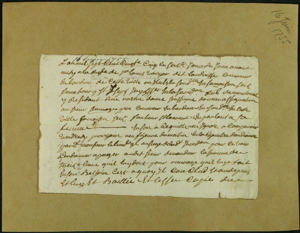 - Ce dossier de matière civile se compose du rapport de l'assignation servie à Sauvage, père, à la requête de Louis Vachard dit Lardoise, pour lui payer la somme de 8 livres qu'il lui doit pour son ouvrage. On cite le Faubourg Saint-Laurent comme lieu du procès ou de l'action dans le document