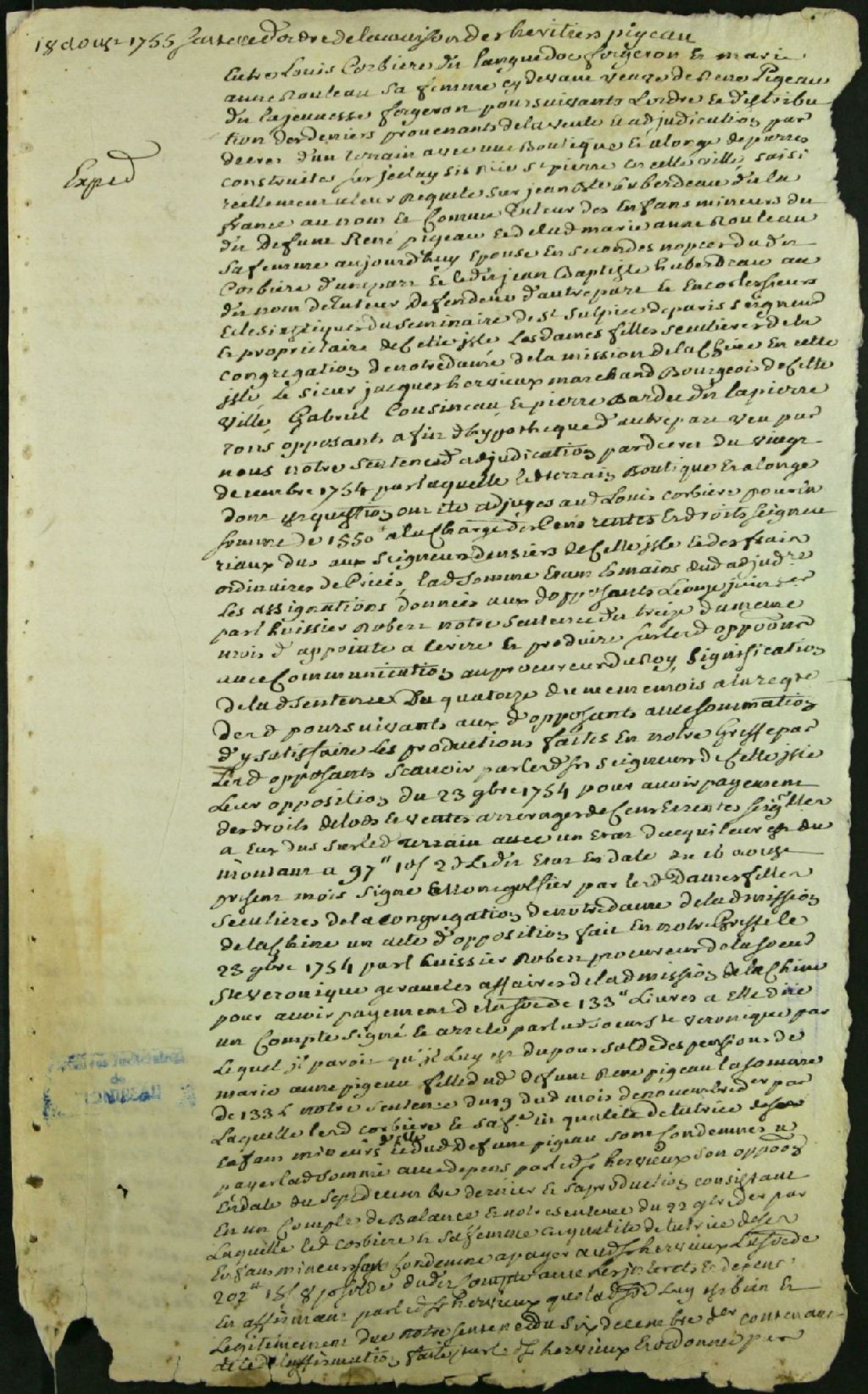 - Ce dossier de matière civile se compose des pièces suivantes : la sentence d'ordre et de distribution des deniers provenant de la vente par criée d'un terrain avec boutique et allonge de pierre rue Saint-Paul, saisis à la requête de Louis Corbière dit Languedoc, et sa femme, Marie-Anne Rouleau sur Jean-Baptiste Huberdeau dit Lafrance, en sa qualité de tuteur des enfants mineurs de feu René Bigeot ; les quittances par Jean-Baptiste Hervieux et Pierre Bardet dit Lapierre, créanciers, et par Marie Maugue dite soeur Sainte-Marguerite, fille séculière de la Congrégation de Notre-Dame, dépositaire. Les documents mentionnent les seigneurs de Montréal, la soeur sainte Véronique, gérante de la Congrégation Notre-Dame de Lachine, et Gabriel Cousineau en tant qu¿opposants