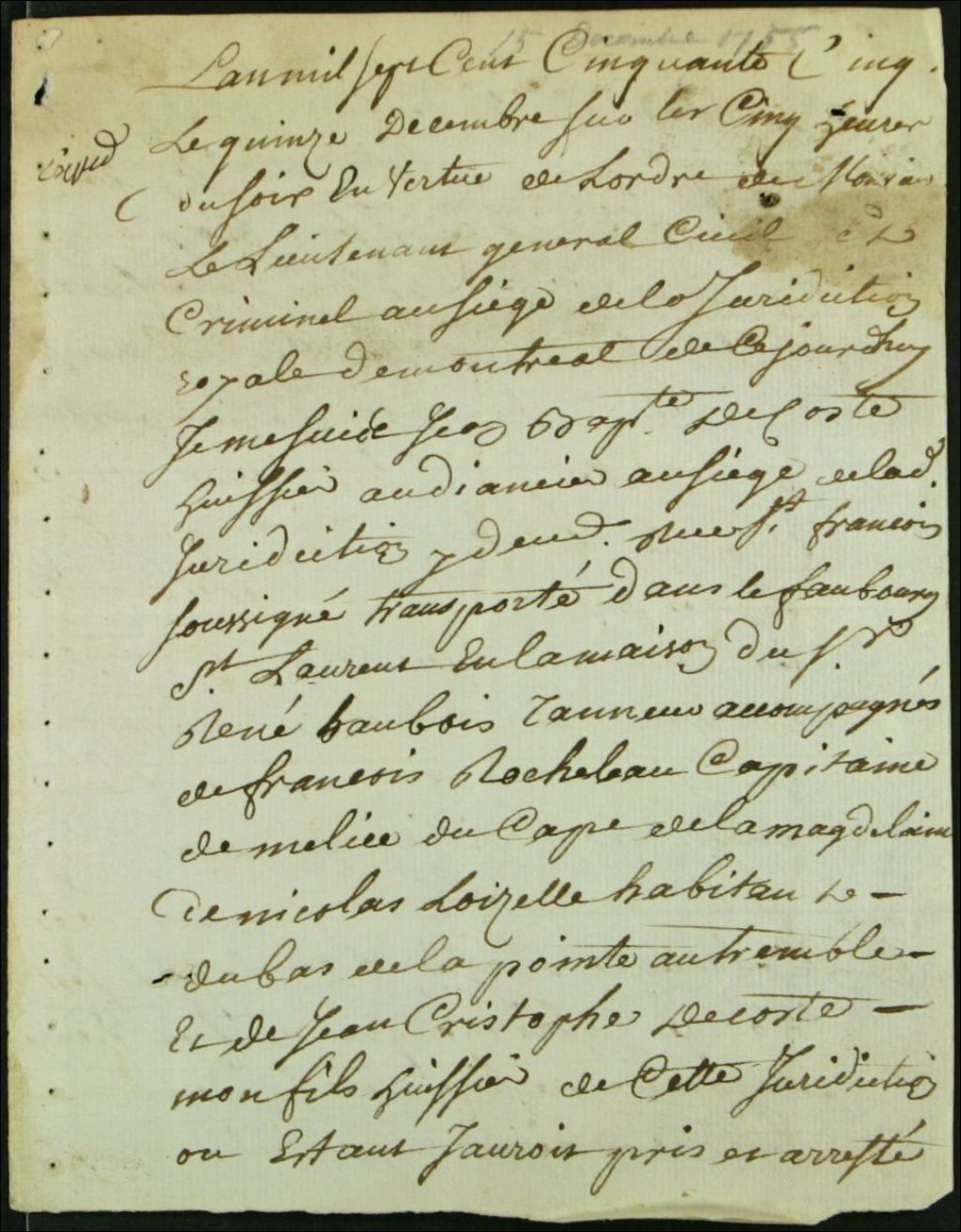 - Ce dossier de matière criminelle est compose des pièces suivantes : le procès-verbal de l'arrestation d'un quidam à l'habit gris, nommé René Lusignan, lequel se trouve en possession de 12 fausses cartes, d'étampes et d'un écritoire et de son incarcération par Larchevêque ; les procès-verbaux de la remise au greffe des pièces à conviction et de leur description ; le requête pour la tenue d'une information judiciaire ; l¿ordre pour assigner les témoins du procureur du roi ; les interrogatoires de René Lusignan, né en 1729, se disant chirurgien, demeurant chez le notaire Dupont, près de Québec. Il serait arrivé en cette colonie en 1743 sur le vaisseau "Le Léopard" et aurait fait un voyage aller-retour en France. Il dit que les fausses cartes ne sont pas à lui mais ne peut divulguer à qui elles appartiennent. Il dit en avoir utilisé plusieurs pour payer certains de ses achats.Le dossier contient aussi : la requête pour décréter la prise de [...]