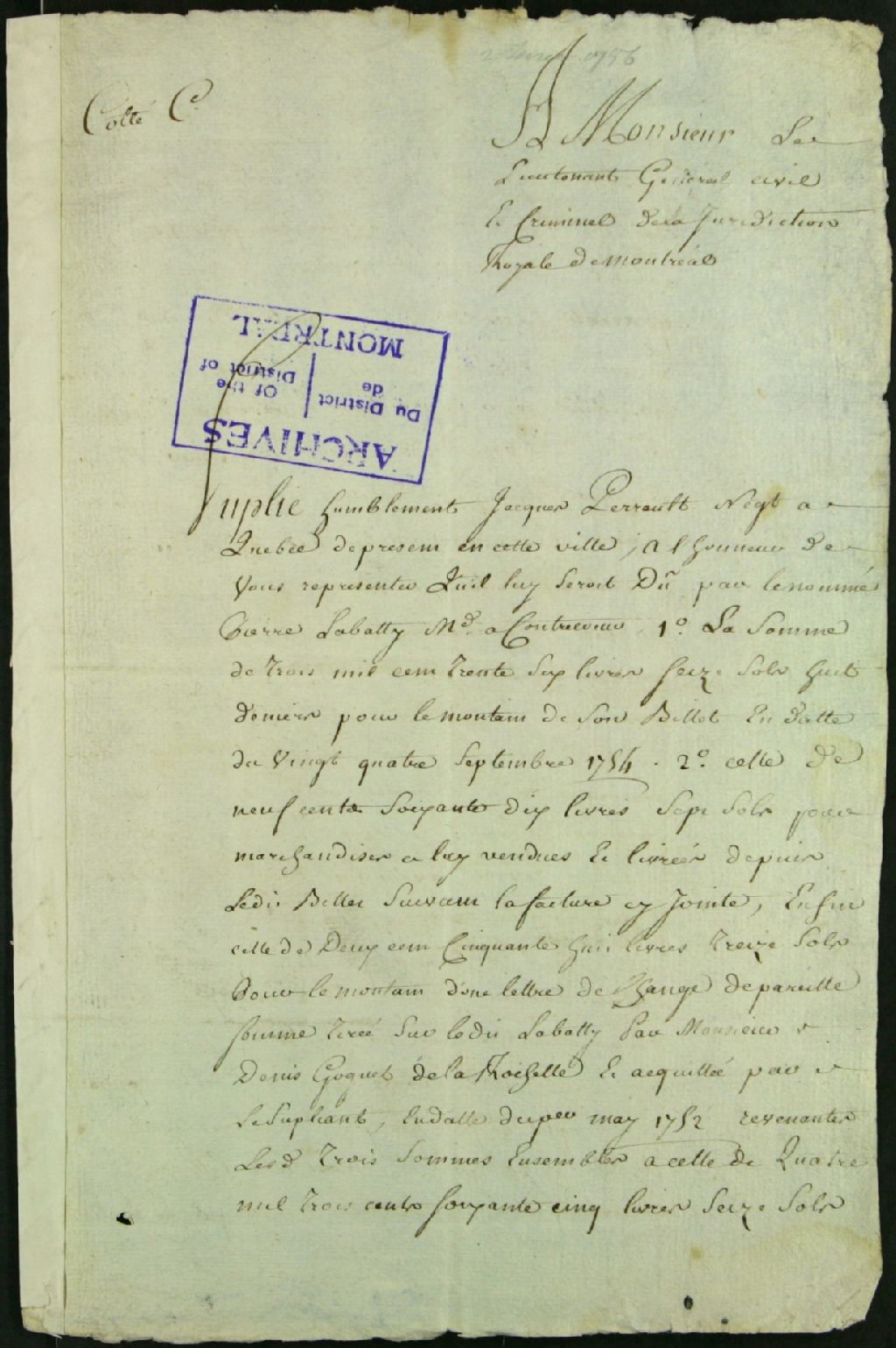 Procès entre Jacques Perrault, négociant de Québec, demandeur, et Pierre Labaty, marchand de Contrecoeur, défendeur, pour payement de dettes