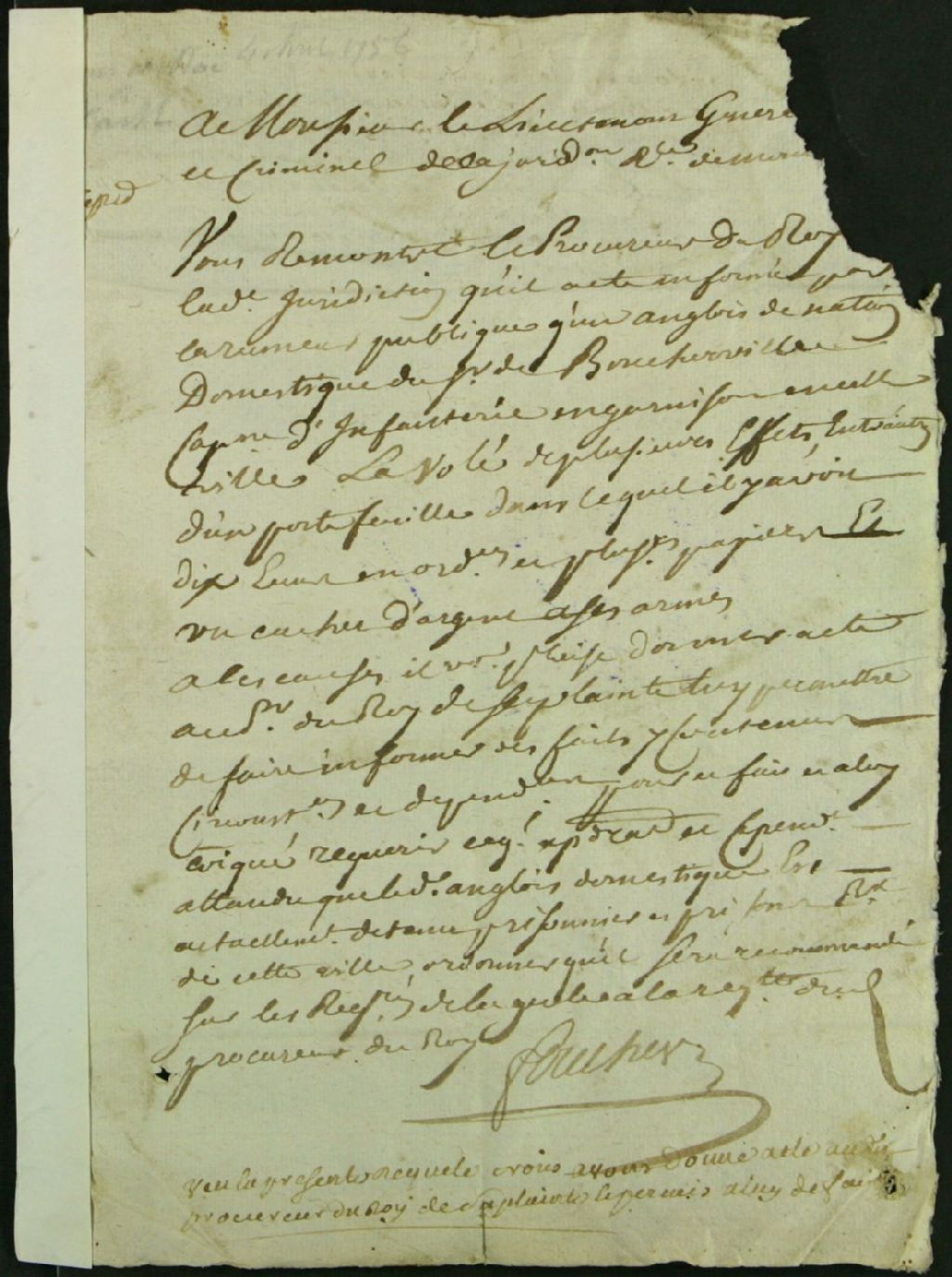- Ce dossier de matière criminelle est composé des pièces suivantes : la requête pour la tenue d'une information judiciaire contre Jean Clark, domestique chez Pierre Boucher de Boucherville, accusé d'avoir volé à ce dernier un cachet d'argent, un portefeuille et plusieurs bouteilles de vin ; la permission accordée ; l'ordre à Louis Daveluy dit Larose d'agir comme interprète et de prêter serment ; le procès-verbal de serment ; l'interrogatoire de Jean Clark, âgé de 35 ans, fait prisonnier au fort Cumberland, Maryland, domestique de Pierre Boucher, lequel dit n'avoir jamais rien volé ; la déclaration du procureur du roi à l'effet que Pierre Boucher lui a remis un cachet d'argent que lui a apporté le père Jean-Louis de Lacorne dit Maurice, Récollet, lequel cachet a été remis en main du greffier ; les rapports d'assignations ; l'information judiciaire ; la requête pour faire décréter la prise de corps contre l'accusé ; le décret de prise de corps ; le rapport d'écrou ; la signification de l'acte d'écrou à l'accusé ; la requête pour le récolement des témoignages ; les procès-verbaux de récolements des témoignages et des confrontations entre les témoins et l'accusé ; le réquisitoire pour que l'on applique la question ordinaire et extraordinaire à l'accusé ; le procès-verbal de l'interrogatoire de Clark sur la sellette, en présence des assesseurs François Simonnet et Gervais Hodiesne, notaires ; la sentence qui condamne l'accusé à subir la question ordinaire et extraordinaire ; l'appel de sentence ; l'ordre de transfert du prisonnier au palais de Québec ; et l'inventaire des pièces soumises par le greffier. Les documents mentionnent les témoins suivant : Jean Devin, 32 ans, irlandais, journalier ; son épouse, Marie Robidou, 51 ans ; Jac. Donine, 25 ans, anglais, journalier chez Jac. Beaudry ; et William Bryan, 27 ans, prisonnier, journalier chez Fonblanche. Jean Denis est cité dans ces documents