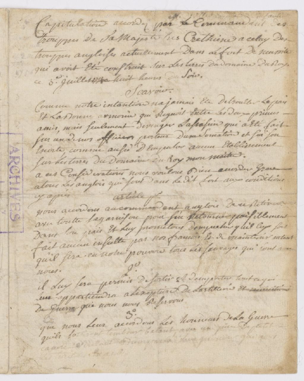 - Procès devant le Conseil de guerre contre Robert Stobo, natif de Glasgow en Ecosse, et Jacob Van Braam, natif de Hollande, gentilhomme, tous deux capitaines dans les troupes de Virginie, pris en otage au fort Necessity, demeurant habituellement à Fredericksburg et accusés d'espionnage