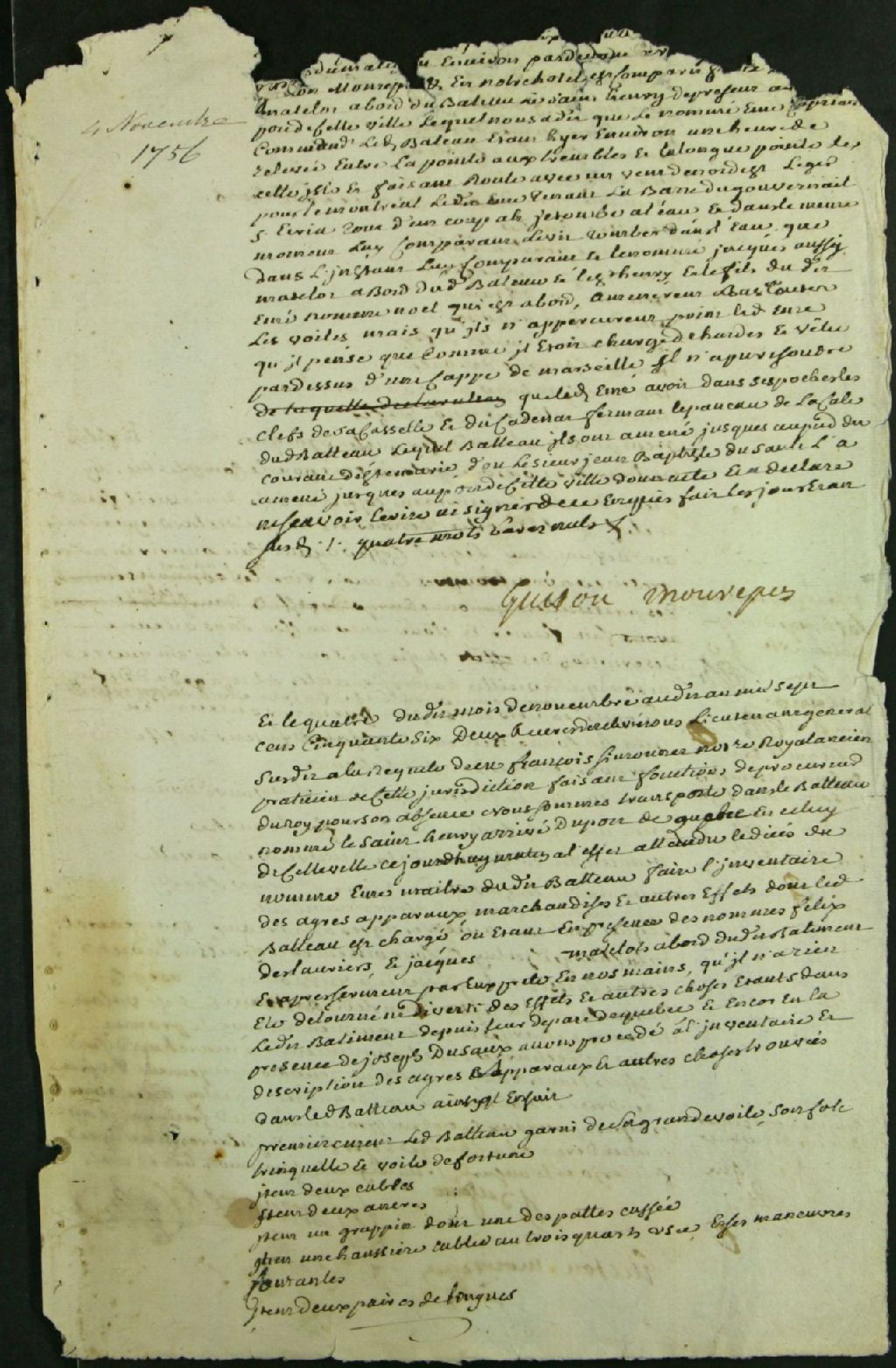 - Ce dossier d'administration judiciaire est d'abord composé de la déclaration faite par Félix [Deslauriers?], matelot à bord du bateau le Saint-Henri, expliquant que hier, en venant de Québec, entre Pointe-aux-Trembles et la Longue-Pointe, le capitaine Edmé Rouelle étant à la barre, le comparant le vit tomber à l'eau et il n'est point remonté à la surface. Ils ont conduit le bateau au pied du courant Sainte-Marie, d'où le sieur Jean-Baptiste Dussault l'a amené jusqu'au port de cette ville. Le procès-verbal de l'inventaire du bateau, en présence de Joseph Dufault, nommé gardien des marchandises, complète le dossier. Les documents citent Jacques Briant, matelot, et Noël Rouelle, fils de Edme