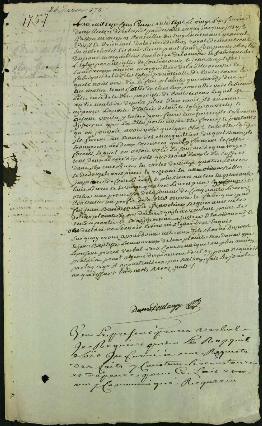 - Procès entre Charles Dupont, marguillier en charge à Contrecoeur, et Jean-Baptiste Lamoureux, ancien marguillier, plaignants, et Pierre Gouet dit Lalime, armurier, accusé de vol par effraction