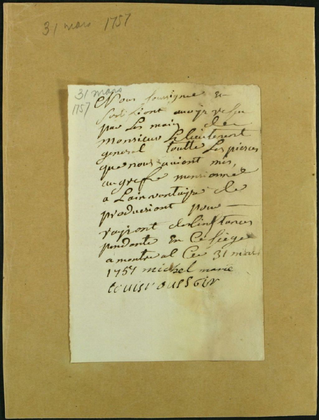 Quittance de Michel Marié et Louis [L'Au?] au lieutenant général pour retour d'exhibits, 31 mars 1757, Archives nationales à Montréal, Fonds Juridiction royale de Montréal, (06M,TL4,S1,D6150).