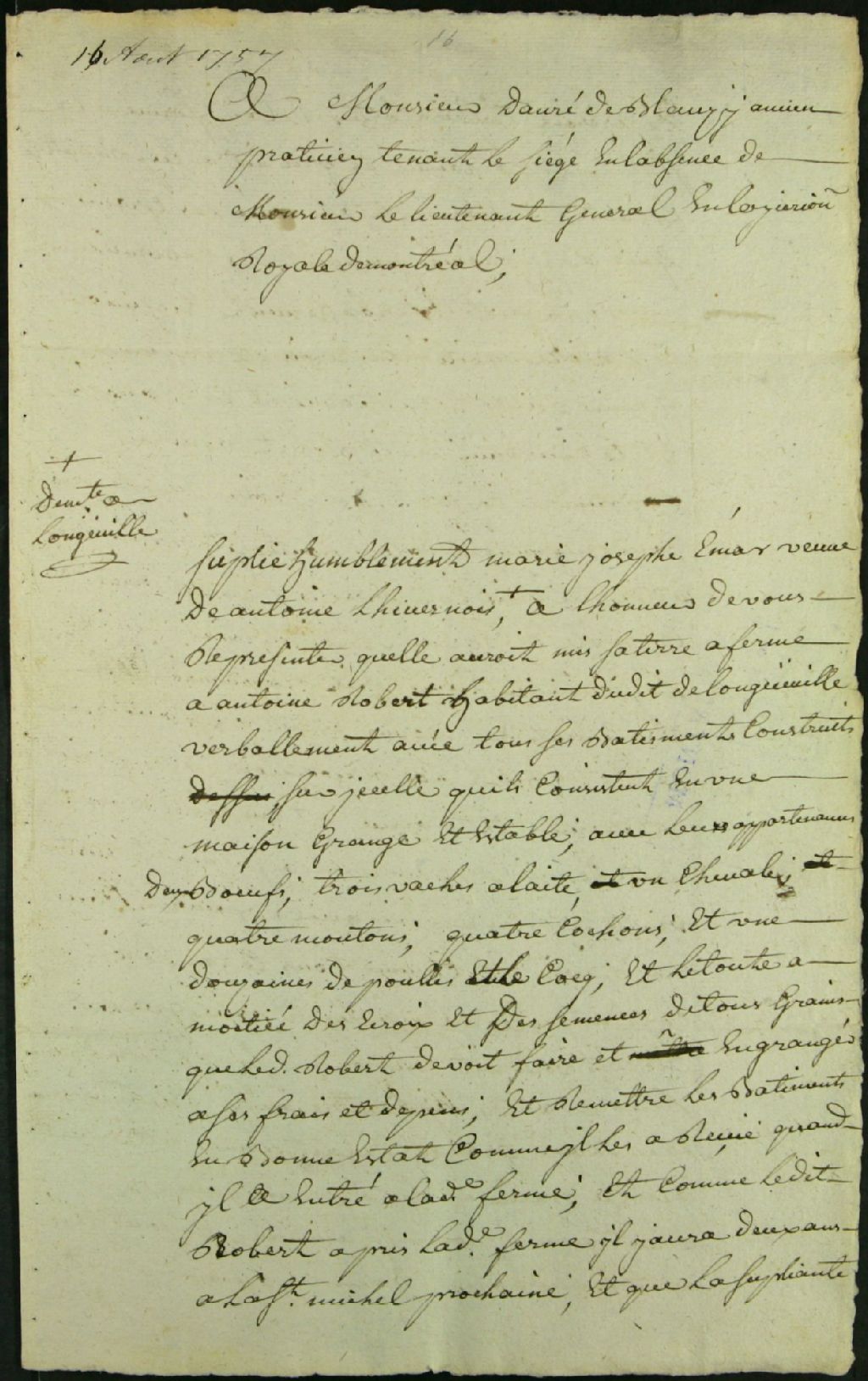 - Procès entre Marie-Josèphe Émard, veuve de Antoine Benoît dit Livernois, demanderesse, et son fermier Antoine Robert, habitant de Longueuil, défendeur, pour le marché d'un bail à ferme