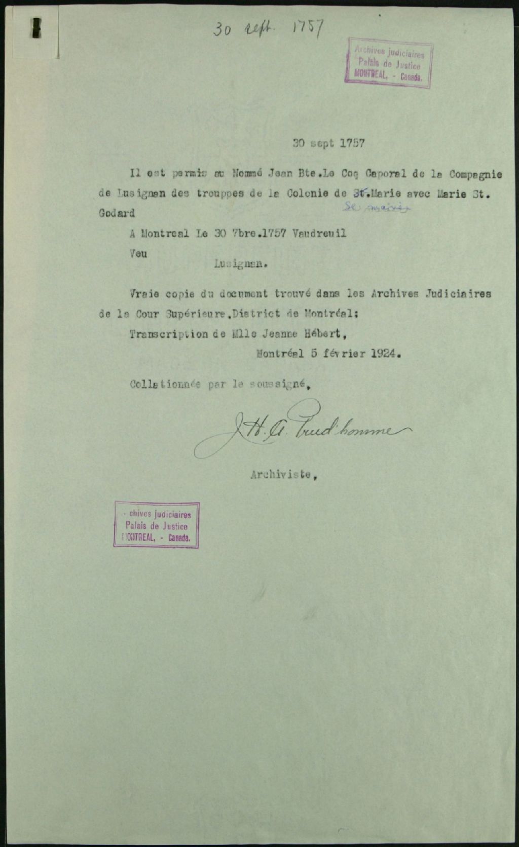 - Ce dossier d'administration militaire est composé de la permission accordée par Vaudreuil à Jean-Baptiste Lecoq, de se marier avec Marie Godard. C'est signé par Vaudreuil et Dazemar de Lusignan