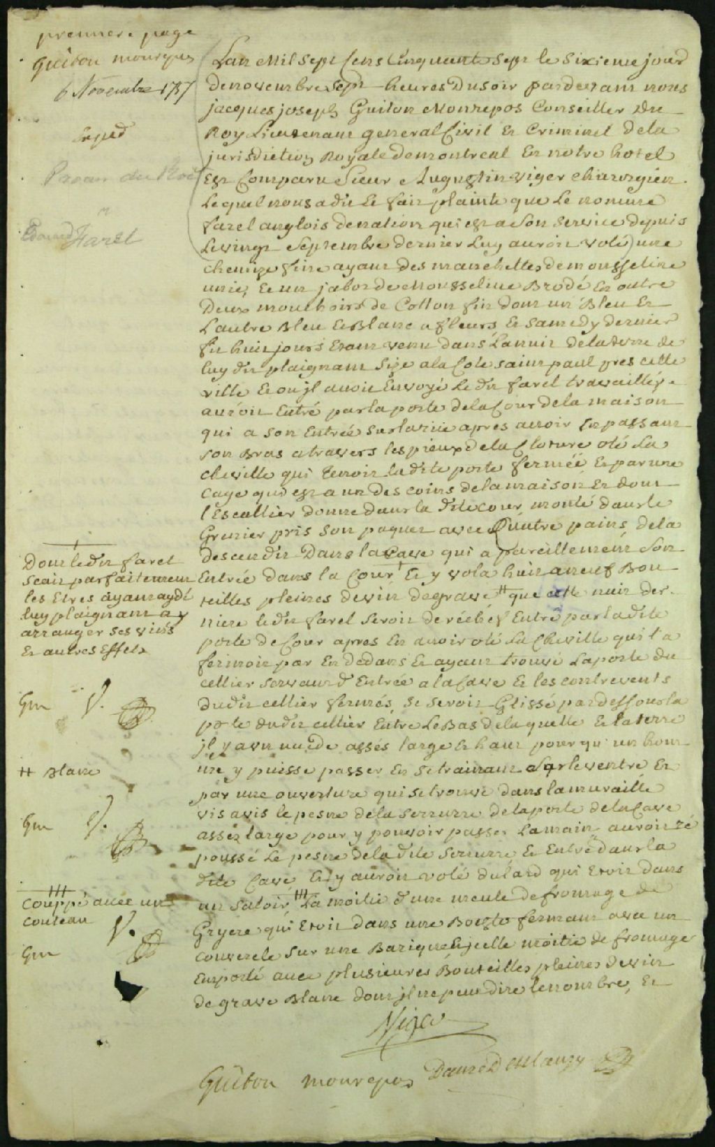 Ce dossier de matière criminelle est composé des pièces suivantes : la plainte de Augustin Viger contre Édouard Farel, 21 ans, qui était à son service depuis le 20 septembre dernier, qu'il accuse de lui avoir volé une chemise, des mouchoirs, de nombreuses bouteilles de vin, du lard, pain et fromage, en forçant une serrure pour entrer dans sa cave, après avoir quitté son emploi, sans avis ; l'ordre d'arrêter Farel et de renvoyer la plainte devant le plus ancien praticien faisant fonction de procureur du roi, en son absence ; la requête pour la tenue d'une information ; la permission accordée ; l'ordre qui s¿en suit ; les procès-verbaux de l'arrestation d¿Édouard Farel et de la visite des lieux par le lieutenant général accompagné du prisonnier ; le rapport d'assignation à Louis Daveluy dit Larose, interprète en langue anglaise ; le serment d'office ; l'interrogatoire de Farel, lequel prétend avoir reçu les articles du cuisinier nommé Cazeneuve ; les rapports d'assignations aux témoins ; l'information judiciaire ; le décret de prise de corps contre Farel ; l'ordre d'écrou ; le procès-verbal d'écrou et de significations au prisonnier ; la requête et l'ordre pour arrêter André Malaguen, 22 ans ; le procès-verbal de capture par l'huissier Houlier, accompagné de fusiliers, au domicile de André Ripaille dit Champagne, à Côte-de-Liesse. François Guino, soldat de la 8ème Compagnie de la marine, et François Petit dit Leroy, caporal de la même Compagnie, sont alors escorte.Le dossier contient également : le décret de prise de corps de Malaguen ; l'ordre d'écrou ; le procès-verbal d'écrou et les significations au prisonnier ; l'interrogatoire de Malaguen ; la requête pour aller faire d'urgence le récolement de Guillaume Vanden Houde, 21 ans, menuisier, gravement malade de la petite vérole à l'Hôtel-Dieu ; le procès-verbal du récolement à son chevet ; la requête pour la perquisition du sac de Farel chez Pierre Martin ; le dépôt d'un mouchoir bleu marqué L.P. et d'un morceau de fromage au greffe ; les interrogatoires des accusés le 20 décembre ; les requêtes pour le récolement, les confrontations des témoins et accusés et une information par addition ; la permission ; l'information au cours de laquelle les témoins Joseph Lepage, 44 ans, et sa femme, Madeleine Viger, 33 ans, reconnaissent le mouchoir trouvé dans le sac de Farel ; les procès-verbaux des récolements et des confrontations entre témoins et accusés et entre ceux-ci ; les conclusions définitives pour que les accusés soient déclarés dûment atteint d'avoir volé chez Viger et soient pendus en place du marché ; les interrogatoires des accusés sur la sellette en présence des assesseurs André Souste et Gervais Hodiesne, notaires.Le dossier contient en outre l'extrait des registres de la sentence rendue qui déclare Édouard Farel dûment atteint d'être sorti du service de Viger à son insu et d'avoir par deux fois volé du fromage, vins, chemise et mouchoirs, en forçant une serrure. André Malaguen est reconnu complice participant. Les deux sont condamnés à être pendus en place du marché. Le dossier est finalement composé des pièces suivantes : l'appel de sentence par Simonnet ; l'ordre de transfert des prisonniers au palais de Québec ; la transcription scellée d'un arrêt du Conseil Supérieur qui déclare que le procès de Farel a été bien jugé, qui renvoie Farel devant le lieutenant général de Montréal et qui ordonne d'appliquer la question ordinaire et extraordinaire à Malaguen pour apprendre la vérité ; le procès-verbal du prononcé de la sentence à Édouard Farel et après le sacrement de confession par le père LaValinière il a été remis en mains de l'exécuteur de la haute justice à trois heure ; la transcription de l'arrêt du Conseil Supérieur qui met la sentence prononcée contre Malaguen à néant et le condamne à être battu et flétri au fer chaud de la fleur de lys sur les épaules et à être banni trois ans de la colonie ; et le prononcé de la sentence à Malaguen avec remise en mains de l'exécuteur de la haute justice.Les documents mentionnent les témoins suivant : Pierre Blain, 43 ans, de Côte-de-Liesse ; Pierre Martin dit Ladouceur, 31 ans, de Côte-de-Liesse ; Jeanne Fourneau, 50 ans, veuve de Pierre-Paul Bourgeat ; Angélique Bourgeat dit Provençal, 12 ans ; Peter [Baconier?], 24 ans, journalier chez Cavelier ; Jean Hamilton, 29 ans, charpentier à St-Gabriel ; et Daniel Salmon, 35 ans, cordonnier