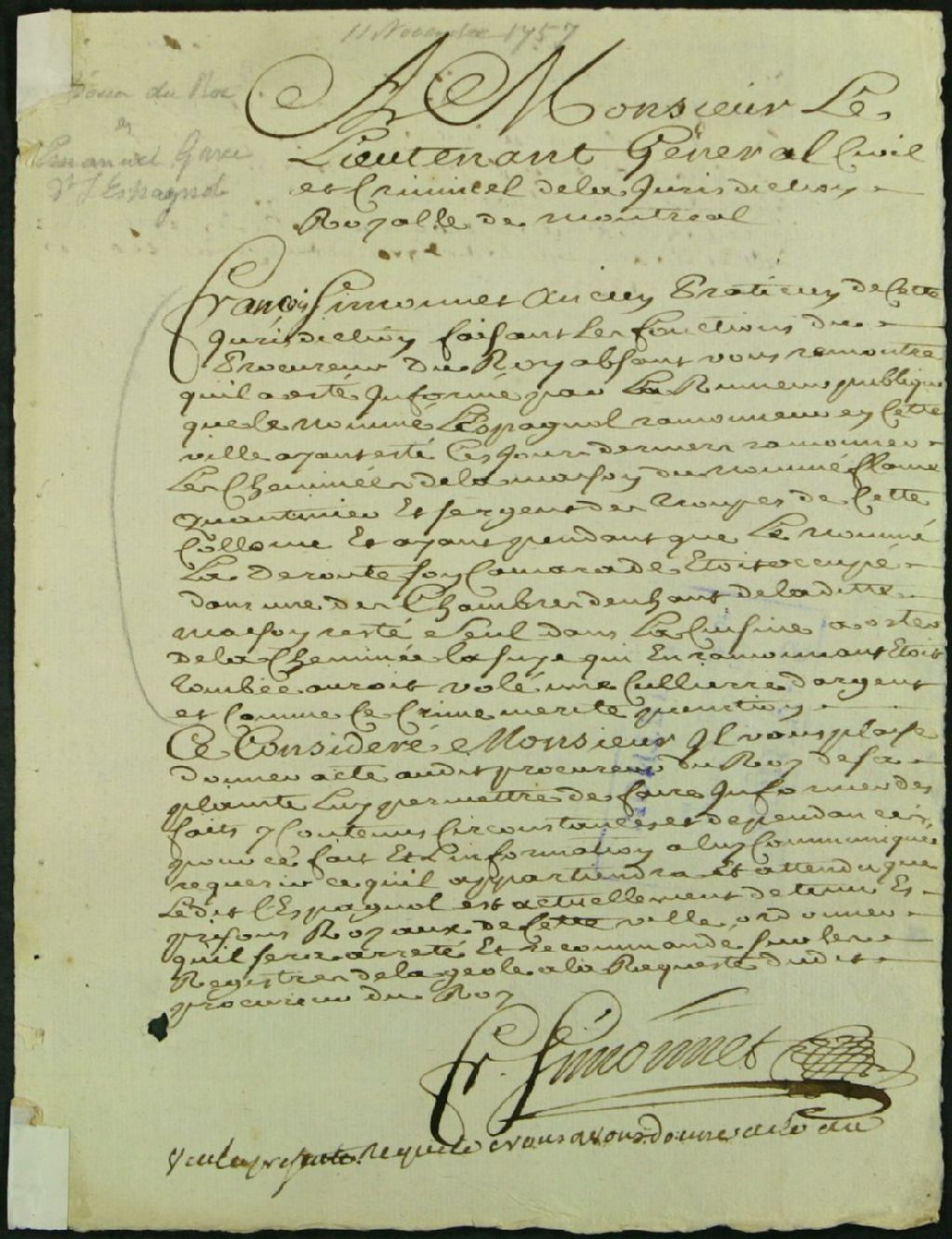 - Ce dossier de matière criminelle est composé des pièces suivantes : la requête pour la tenue d'une information contre Manuel Garcir dit Lespagnol, 57 ans, accusé d'avoir volé une cuillère en argent chez Nicolas Flame, sergent et cantinier, et son épouse Marie Seteau dit Sanschagrin, alors qu'il faisait le ramonage de la cheminée ; la permission de faire informer ; l'ordre d'arrêter Lespagnol ; les procès-verbaux de l'interrogatoire de ce dernier ; les rapports d'assignation aux témoins ; l'information judiciaire ; la requête pour décréter la prise de corps contre Lespagnol ; le décret de prise de corps ; la transcription scellée de ladite prise ; le rapport de signification ; le procès-verbal d'écrou par Larchevêque, concierge des prisons ; la requête pour le récolement des témoignages ; l'ordre de ce faire ; le procès-verbal dudit récolement et des confrontations entre les témoins et l'accusé ; l'ordonnance pour faire assigner les témoins à comparaître ; le réquisitoire définitif du substitut procureur du roi ; le procès-verbal de l'interrogatoire de Garcir sur la sellette, en présence des assesseurs André Souste et Gervais Hodiesne, notaires ; la transcription de la sentence de culpabilité de vol prononcé contre Garcir, pour lequel crime il est condamné à être pendu et étranglé en place du marché et à 200 livres d'amende ; l'appel de sentence ; l'ordre de transfert de Garcir à Québec ; la transcription scellée d'un arrêt du Conseil Supérieur qui met à néant l'appel, mais condamne l'accusé à être battu, fustigé et marqué de la fleur de lys à l'épaule, en place du marché à Montréal puis à être déporté en France pour servir trois années sur les galères de sa majesté ; et le prononcé de la sentence à l'accusé avec remise en main à l'exécuteur de la haute justice. Les témoins suivant sont mentionnés dans cette affaire : Jean Meran dit Jolibois, 25 ans, soldat du régiment Languedoc ; Marin Augias, 65 ans, journalier, demeurant chez Flame ; Jean-Baptiste Boyer dit Ladéroute, 64 ans, ramoneur ; et Angélique Roza, 32 ans, épouse de Jean Rigaud, journalier
