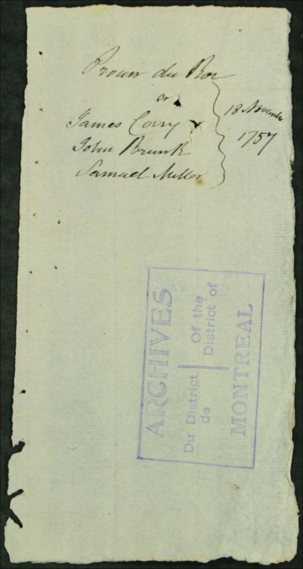 - Ce dossier de matière criminelle est composé des pièces suivantes : la requête pour la tenue d'une information et l¿arrestation de deux allemands qui ont écoulés de fausses ordonnances ; la permission accordée ; le procès-verbal de la capture des deux individus par l'huissier Nicolas François Robert, accompagné de [Crépon?] caporal au régiment de Béarn, suivant les indications de Joseph Poultin dit [Perelle?]; le procès-verbal de la remise de quatre billets d'ordonnance au greffe par l'huissier Robert ; la requête pour établir la description des billets ; les trois faux billets d'ordonnance ; l'information judiciaire ; le rapport d'assignations aux autres témoins ; la requête pour faire décréter la prise de corps contre les deux accusés ; le décret de prise corps ; les rapports d'écrou et d'assignation à Louis Daveluy, interprète, pour remplacer Pollinger, absent ; et le procès-verbal des interrogatoires de Jean Brunh, âgé de 19 ans, et James Corey, âgé de 22 ans. Le premier dit demeurer depuis peu chez la veuve Beaudry à Longue Pointe et avoir reçu les faux billets d'ordonnance de son oncle Corey. Le second dit demeurer chez Louis Gervais à la Pointe-aux-Trembles depuis mai dernier. Il affirme que les quatre billets lui ont été remis par Samuel Miller, lequel est domicilié chez François Dagenais à Côte-St-Michel. Il a échangé un billet qu'il savait faux contre des articles chez Thomas.Le dossier contient également : l'ordonnance pour la prise de corps de Samuel Miller ; le procès-verbal de recherche et de perquisition chez Dagenais ; la proclamation d'avis de recherches au son du tambour de Meray dit Francoeur, en place publique et devant chez Dagenais ; les requêtes pour une addition d'information et le récolement ; les procès-verbaux des récolements des témoignages, dont ceux des interrogatoires des accusés, et des confrontations entre les témoins et les accusés et entre les accusés eux-mêmes ; le réquisitoire du commis procureur du roi ; les interrogatoires des accusé sur la sellette en présence des assesseurs et notaires André Souste et Gervais Hodiesne ; la transcription de la sentence qui déclare James Corey dûment atteint et convaincu de s'être trouvé nanti de faux billets d'ordonnance et d'en avoir donné un à McKerinen en payement pour des articles, en réparation de quoi il est condamné à être pendu et étranglé après avoir été appliqué à la question. Jean Bruhn est renvoyé de l'action et Miller renvoyé également, faute de preuves. Le dossier est finalement composé des pièces suivantes : l'appel de sentence ; l'ordre de transfert des prisonniers au palais de Québec ; la lecture ; la transcription scellée d'un arrêt du Conseil Supérieur qui dit que le procès a été bien jugé et qui renvoie les prisonniers devant le juge à Montréal avec mention de retenir Brunh en prison jusqu'à ce que la question soit appliquée à Corey ; les procès-verbaux des interrogatoires de James Corey sur la sellette et sous le supplice de l'application de la question ordinaire et extraordinaire afin de savoir s'il a agit seul ou avec la complicité d'autres, ce qu¿il nie ; et le prononcé de la sentence avec rapport à l'effet, qu'après la confession de Corey par le père LaValinière, il a été remis en mains de l'exécuteur de la haute justice pour exécution en place du marché.Les documents mentionnent les témoins suivant : Louis Briquet dit Lefèbvre, 57 ans, marchand de Longueuil ; Marie-Anne Michelon, 36 ans, épouse de ce dernier ; Joseph Tourneur dit St-Joseph, 34 ans, soldat de la Compagnie Trepet, du régiment Béarn ; Charles Dupuy dit Dupuis, 21 ans, soldat de la Compagnie Daubrespy, du régiment Béarn ; Noël Jourdain dit Bellerose, 39 ans, soldat de la même compagnie ; Jean Lorgy dit Comtois, 36 ans, soldat de la Compagnie Trepezet, du régiment Béarn ; Nicolas-Michel Larsonneur, 22 ans, cuisinier chez Guiton ; et Thomas McKermic, 30 ans, matelot, domestique de Guiton