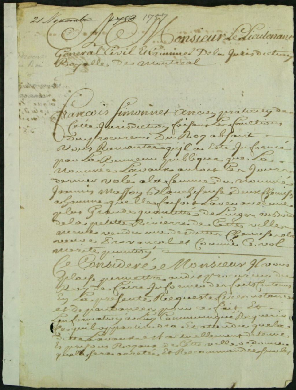 - Ce dossier de matière criminelle est composé des pièces suivantes : la requête pour la tenue d'une information à l'effet que la nommée Lavaux aurait volé à la femme de Joannis, blanchisseuse, deux chemises d'homme qu'elle faisait laver au bord de la petite rivière de cette ville ; les procès-verbaux des interrogatoires de Marie-Anne Deneau, demeurant chez Antoine, jardinier de la rue Saint-Paul, laquelle dit avoir trouvé la chemise en question près de la petite porte menant au bord de l'eau et l'avoir vendu à ladite Provençal ; les ordres pour assigner les témoins ; les rapports d'assignations ; l'information ; la requête pour décréter la prise de corps contre l'accusée ; le décret de prise de corps ; le rapport de signification dudit décret ; le procès-verbal d'écrou signé par Larchevêque ; la requête pour le récolement des témoignages ; les ordres pour ce faire ; le procès-verbaux desdits récolements et des confrontations entre les témoins et l'accusée ; le réquisitoire du substitut procureur du roi ; le procès-verbal de l'interrogatoire de l'accusée sur la sellette, en présence des assesseurs et notaires Gervais Hodiesne et André Souste ; la sentence qui trouve Marie-Deneau atteinte et convaincue d'avoir vendu une chemise appartenant à Henry qu'elle a trouvée et d'avoir déclaré qu'elle l'avait volée, pour lequel crime elle sera mandée en chambre d'audience pour y être blâmée avec défense de récidiver ; la lecture de la sentence à l'accusée ; et le procès-verbal du blâme en chambre d'audience. Les documents mentionnent les témoins suivants : Jeanne Fourneau, 50 ans, veuve de Pierre-Paul Bourgeat ; Marie-Josèphe Bourgeat dit Provençal, fille ; Marie [Gruard?], veuve de Ruparon dit St-Michel et Sanspoil ; et Marie-Louise Ruparon dit St-Michel, surnommé Sanspoil, 12 ans. Chevalier, fils, maître en fait d'armes, époux de M.A. Lavaux est par ailleurs cité