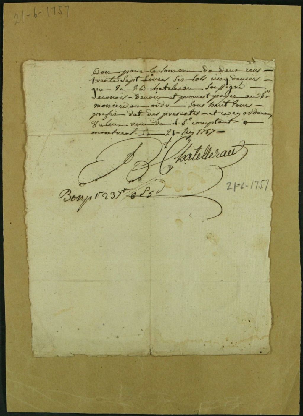 - Ce dossier d'administration judiciaire est d¿abord composé du procès-verbal de l'apposition des scellés sur les choses trouvées fermées à clef dans la maison de François Périnault dit Lamarche, maçon, où est décédé le nommé Chatellerault. Les effets sont laissés à la garde dudit Périnault. Le dossier contient aussi : le procès-verbal de la vente des effets de feu Châtellerault ; la liste détaillée des adjudicataires, prix et articles vendus ; le compte de 30 livres par Houlier pour ses services dans la vente ; la quittance de François Simonnet, faisant fonction de procureur du roi, pour ses vacations ; le rapport de signification d'une opposition à la délivrance des deniers qui proviennent de la vente des effets de Châtellerault, par le chevalier Mercier, capitaine d'artillerie, pour un compte de 851 livres 18 sols et 9 deniers ; le mémoire des frais de vacation du lieutenant général pour avoir procédé à l'apposition et à la levée des scellés ; la quittance à Danré de Blanzy ; le mémoire de ce que François Périnault a fourni à Châtellerault durant sa maladie et pour le drap utilisé pour l'ensevelir, s'élevant à 190 livres et 5 sols ; les quittances de Périnault à Houlier et par Jean-Baptiste Jetté à Houlier pour 12 livres, signée par Bellot et Larsonneur ; et le billet pour la somme de 237 livres 6 sols et 5 deniers signé par Jean-Baptiste Châtellerault, qui promet de le payer à Lemoine Monière d'ici 8 jours, pour valeur reçues comptant