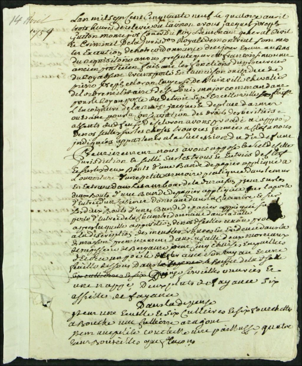 Apposition et levée des scellés chez feu Pierre-Joseph Celoron de Blainville, commandant du poste de Détroit, 14 avril 1759 - 18 avril 1759, Archives nationales à Montréal, Fonds Juridiction royale de Montréal, (06M,TL4,S1,D6262).