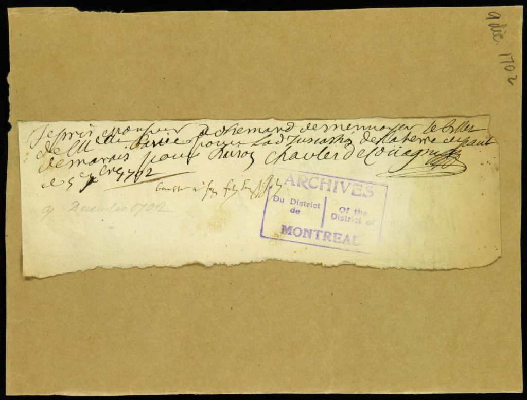 Note de Charles de Couagne, marchand, à Antoine Adhémar concernant l'utilisation d'un billet de Mlle [Carier?], 9 décembre 1702, Archives nationales à Montréal, Fonds Juridiction royale de Montréal, (06M,TL4,S1,D629).