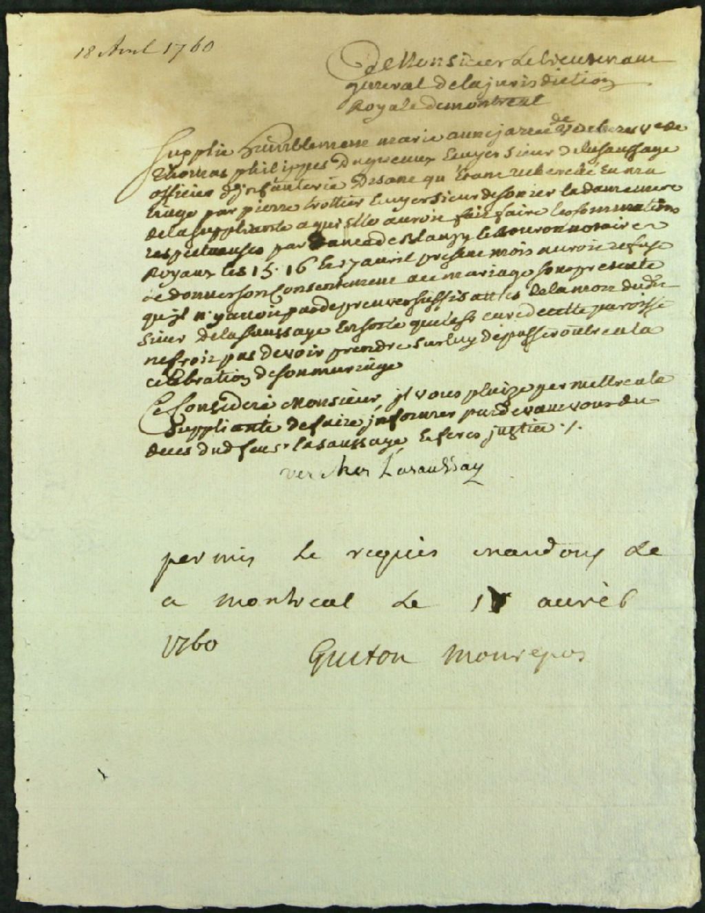 - Sollicitation de Marie-Anne De Verchères pour obtenir confirmation du décès de son mari, Thomas-Philippe Dagneau de LaSaussaye, officier