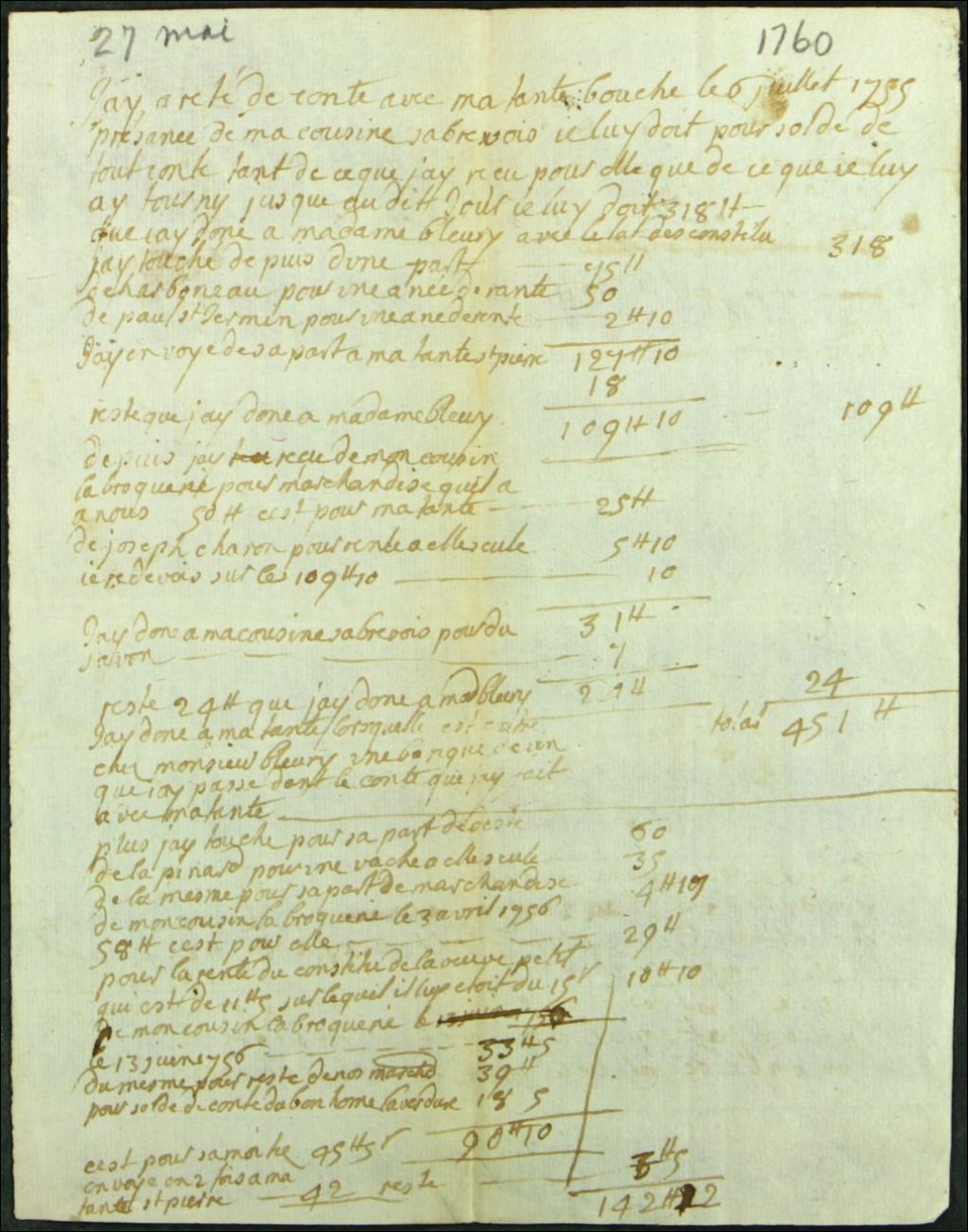 - Ce dossier de matière privée est composé des pièces suivantes : le compte arrêté avec madame Boucher ; la déclaration à l'effet que Portneuf a remis à sa soeur de Muy la somme de 96 livres d'acompte sur ce qu'il peut lui revenir de sa tante Boucher ; et la quittance de Marie-Madeleine de Muy envers sa soeur Portneuf, pour 96 livres d'acompte. Les documents citent Joseph Caron, Paul Saint-Germain et Labroquerie