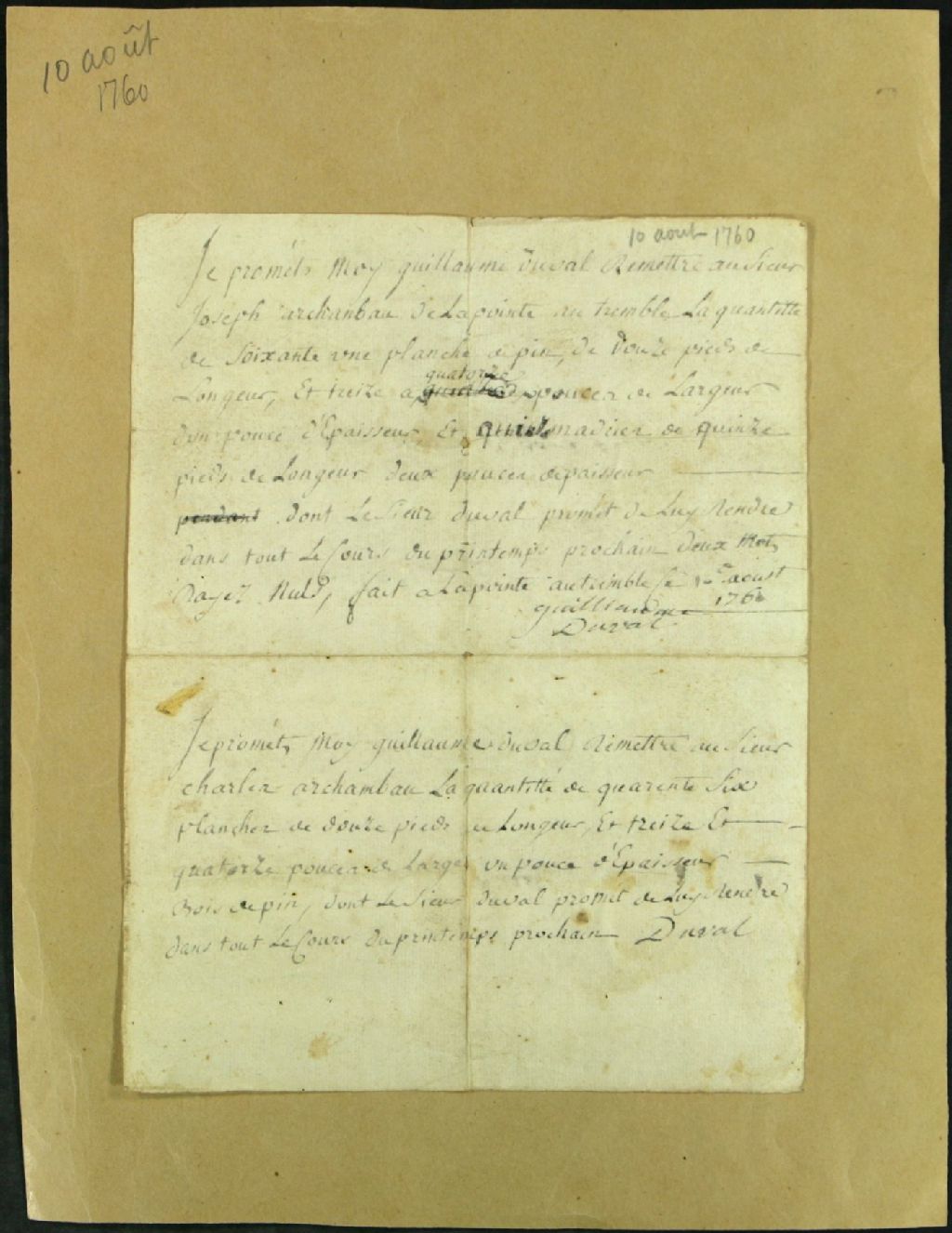 Billets de Guillaume Duval à Joseph Archambault, habitant de Pointe-aux-Trembles, pour fournitures de bois, 10 août 1760, Archives nationales à Montréal, Fonds Juridiction royale de Montréal, (06M,TL4,S1,D6315).