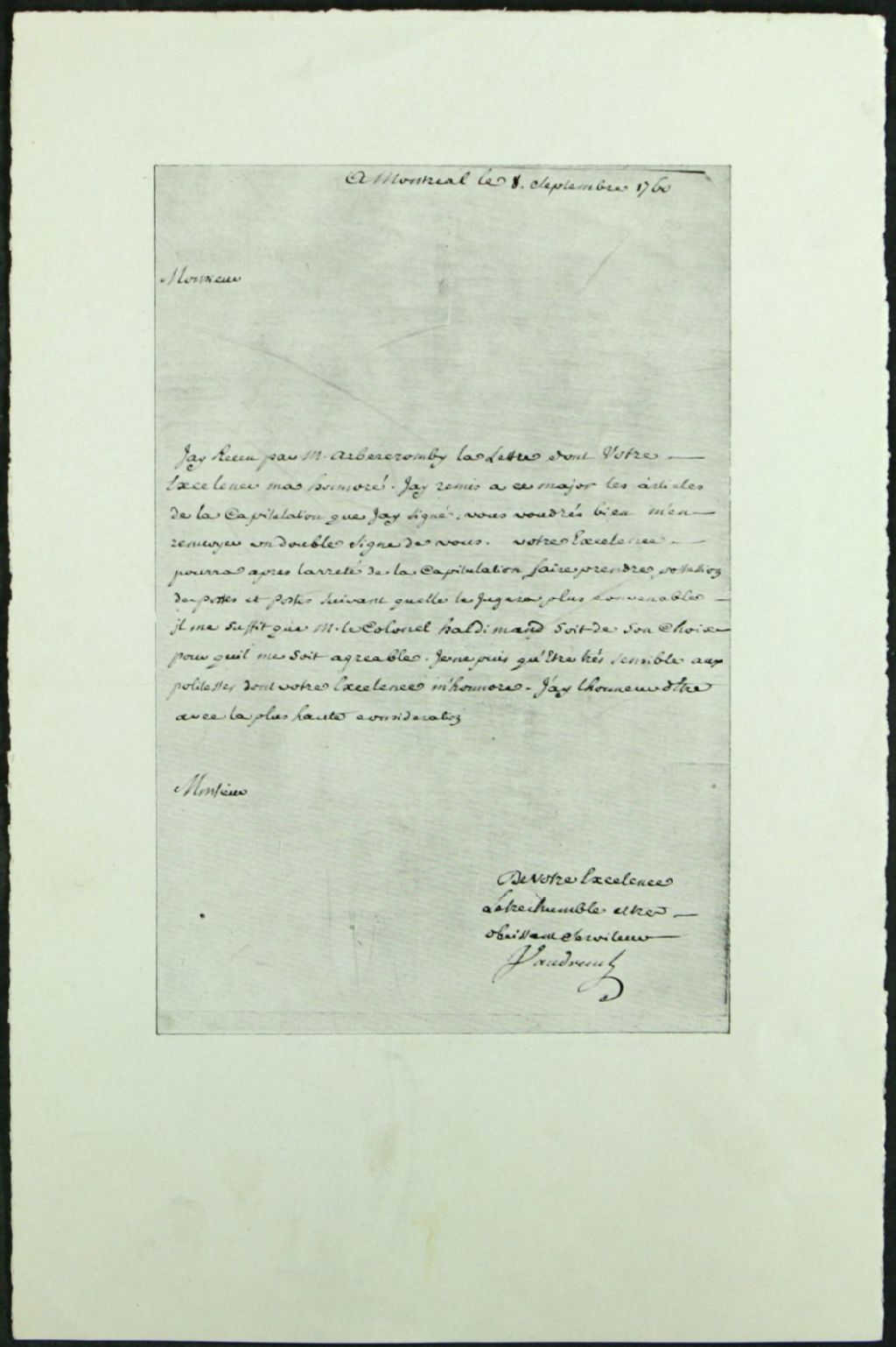 - Lettre du marquis de Vaudreuil au général Amherst pour paraphé les articles de la capitulation de Montréal