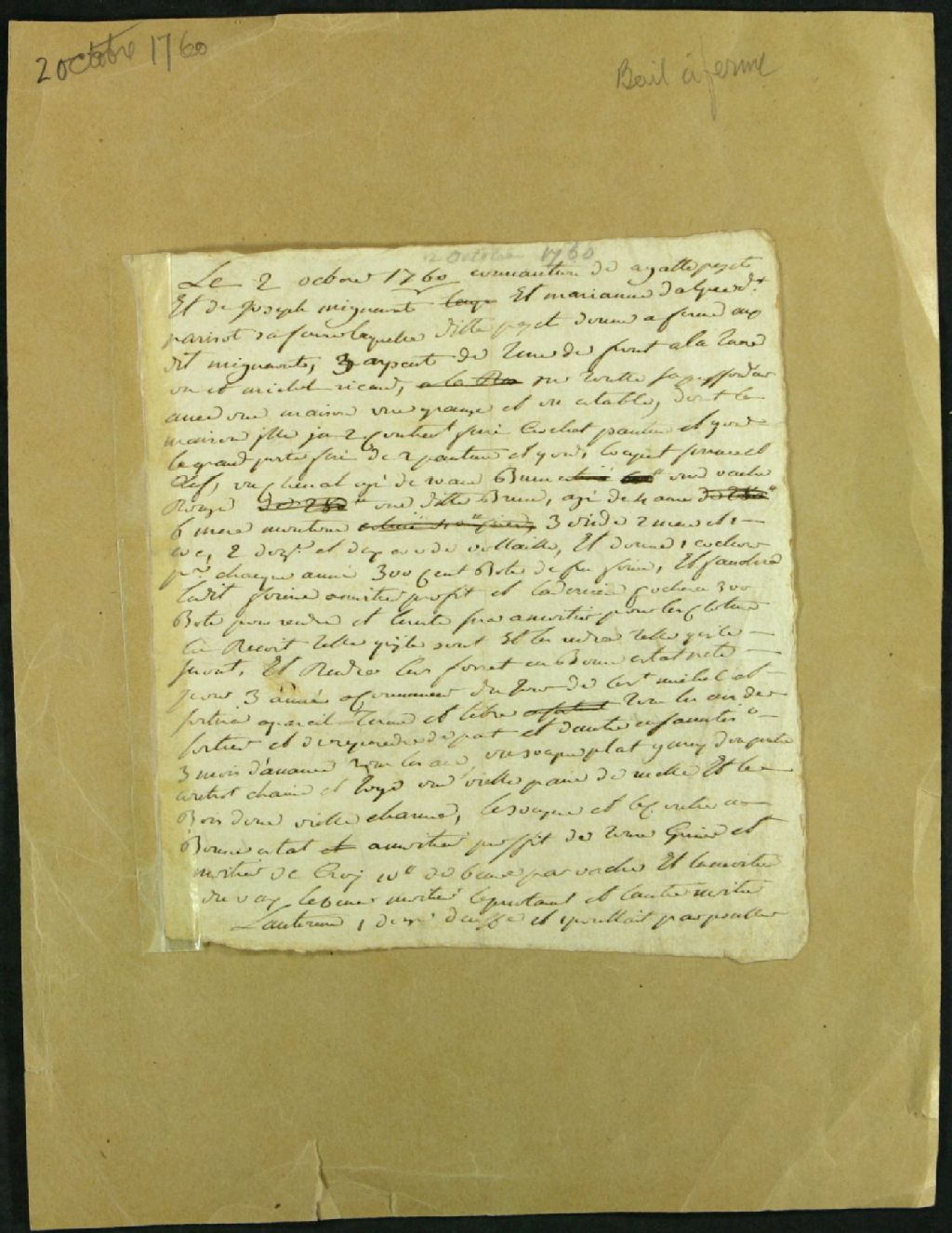 - Ce dossier de matière privée est composé du brouillon inachevé d'une convention passée entre Agathe Payet et Joseph Migneron et sa femme, Marie-Anne Delpé dit Pariseau, par laquelle ladite Payet donne à ferme audit Migneron une terre de trois arpents avec grange et étable pour une durée de trois ans