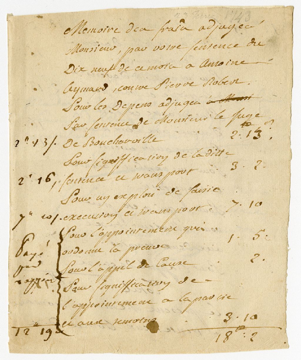 Ce dossier incomplet contient le mémoire des frais au sujet d'une cause dans laquelle Antoine Aymard a été condamné à payer les frais de justice