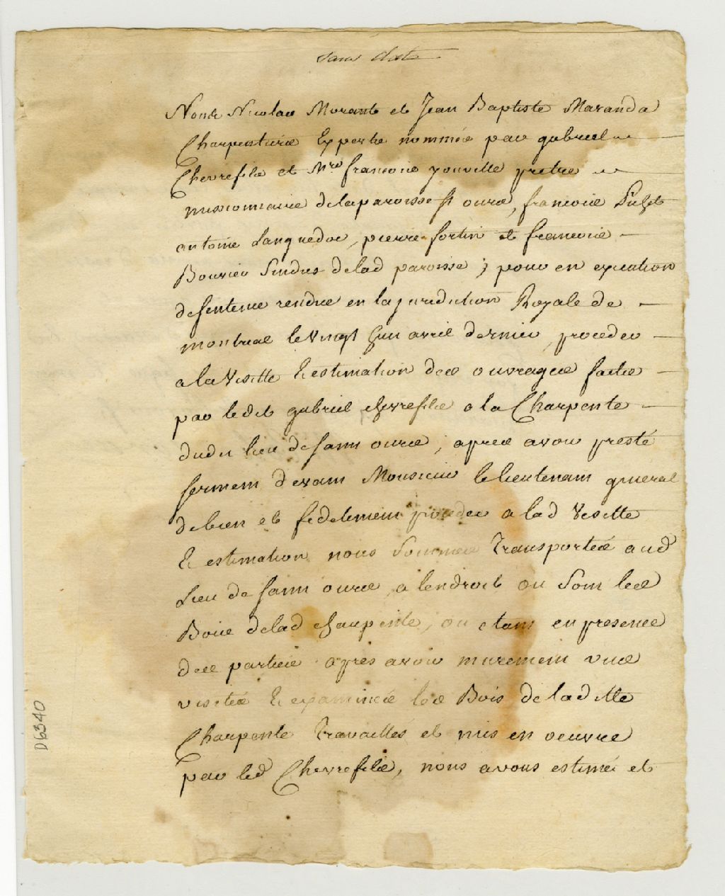 - Ce dossier est composé du rapport de Nicolas Morante et Jean-Baptiste Maranda, charpentiers, experts nommés par Gabriel Chevrefils dit Belisle et François Youville, prêtre missionnaire de la paroisse Saint-Ours, François Piché [dit Dupré], Antoine Languedoc, Pierre Fortin et François Bouvier, syndics de la paroisse en exécution d¿une sentence rendue à Montréal le 28 avril, pour l¿estimation des travaux de Chevrefils