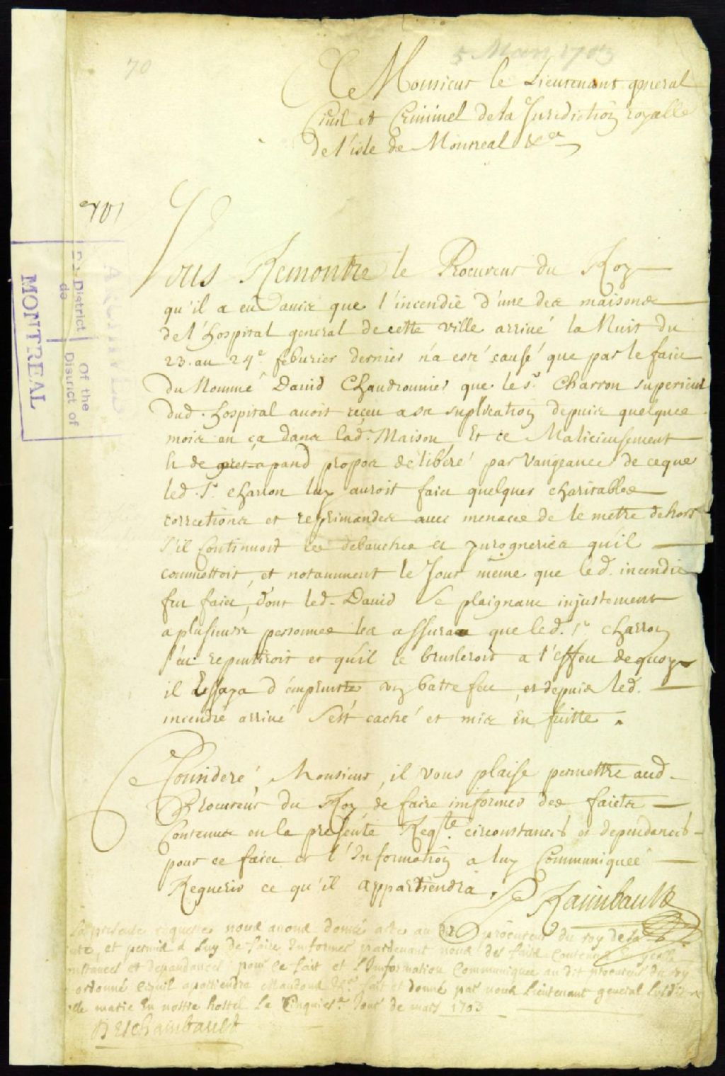 - Ce dossier de matière criminelle est composé des plusieurs pièces dont notamment la plainte du procureur du roi à l'effet qu'il y a eu incendie d'une maison de l'Hôpital général, tenu par les frères Hospitaliers, dans la nuit du 23 au 24 février et que selon toutes apparences il aurait été allumé par David Girardeau, qui a voulu se venger de certaines remontrances faites par les frères Charron. Le dossier comprend aussi l'ordre de comparution aux témoins et plusieurs rapport d'assignations ; plusieurs informations judiciaires incluant les dépositions des témoins ; le décret de prise de corps contre David Giraudeau ; le procès-verbal de perquisition chez Fezeret et la lecture du décret de prise de corps en place publique ; la requête pour le récolement des témoignages et l'ordre de récolement ; l'écrou de David Giraudeau par le sieur Lepailleur, concierge des prisons ; les interrogatoires de l'accusé et les conclusions du procureur pour la confrontation entre les témoins et l'accusé ; les procès-verbaux de récolement ; la confrontation des témoins Legras et Fezeret avec l'accusé ; la requête pour appliquer la question ordinaire et extraordinaire à l'accusé ; l'ordre que l'accusé sera soumis à la question ; l'interrogatoire de l'accusé Giraudeau sur la sellette ; le procès-verbal de l'appel de la sentence au Conseil Souverain par Giraudeau ; et un mémoire des frais.Les témoins dans cette affaire sont : le marchand Jean Legras, 54 ans ; l'arquebusier de 61 ans, René Fezeret ; René Renaud, charpentier âgé de 56 ans ; Jean Nouaille dit Laplaque, soldat de la Compagnie de Cadillac; Antoine Nau dit Lafranchise, soldat de la Compagnie Maricourt; Jacques Niort(de) dit Jolicoeur, soldat de la Compagnie Du Lhut; André Serre dit Saint-Jean, soldat de la Compagnie de Cadillac; et le chaudronnier Séraphin Lauzon, 39 ans