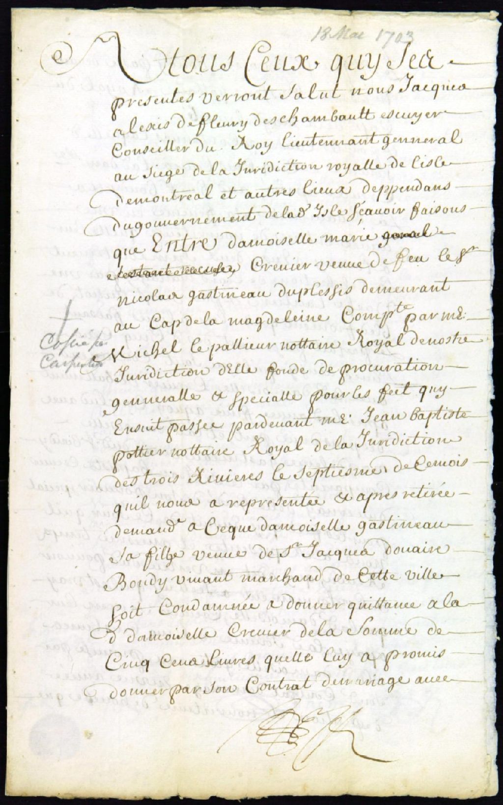 - Ce dossier de matière civile est composé de la transcription scellée d'une sentence datée du 18 mai 1703, servant de quittance d'une dot faite par Marie Crevier envers sa fille Madeleine Gatineau