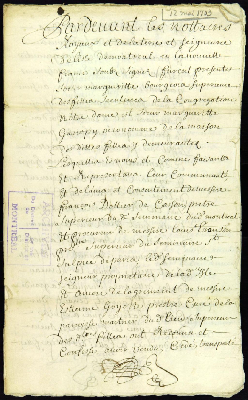 - Ce dossier de matière civile est composé de la pièce suivante : le procès-verbal de saisie des sommes dues par le sieur de Vincennes à Claude Pothier, suite à la requête des soeurs de la Congrégation Notre-Dame, pour obtenir le paiement d'une obligation qui leurs est due pour un emplacement qu'elles ont vendus rue Saint-Paul et une transcription du procès-verbal de la saisie à la suite d'une collation datée du 3 mai 1703, par le notaire Antoine Adhémar, d'un acte passé par le notaire Bénigne Basset le 11 avril 1690 entre les parties, lequel acte est exhibé par Benoît Basset, héritier du notaire Basset