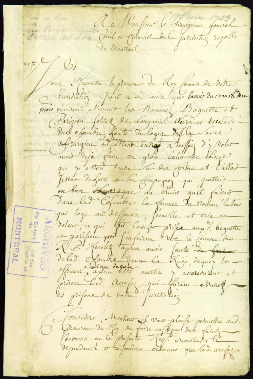 - Procès contre Jacques Boye dit Baguette, boucher, originaire de Poitier, et Louis Henry dit Le parisien, originaire de Paris, tous deux soldats de la Compagnie de Longueuil, accusés de vol par effraction