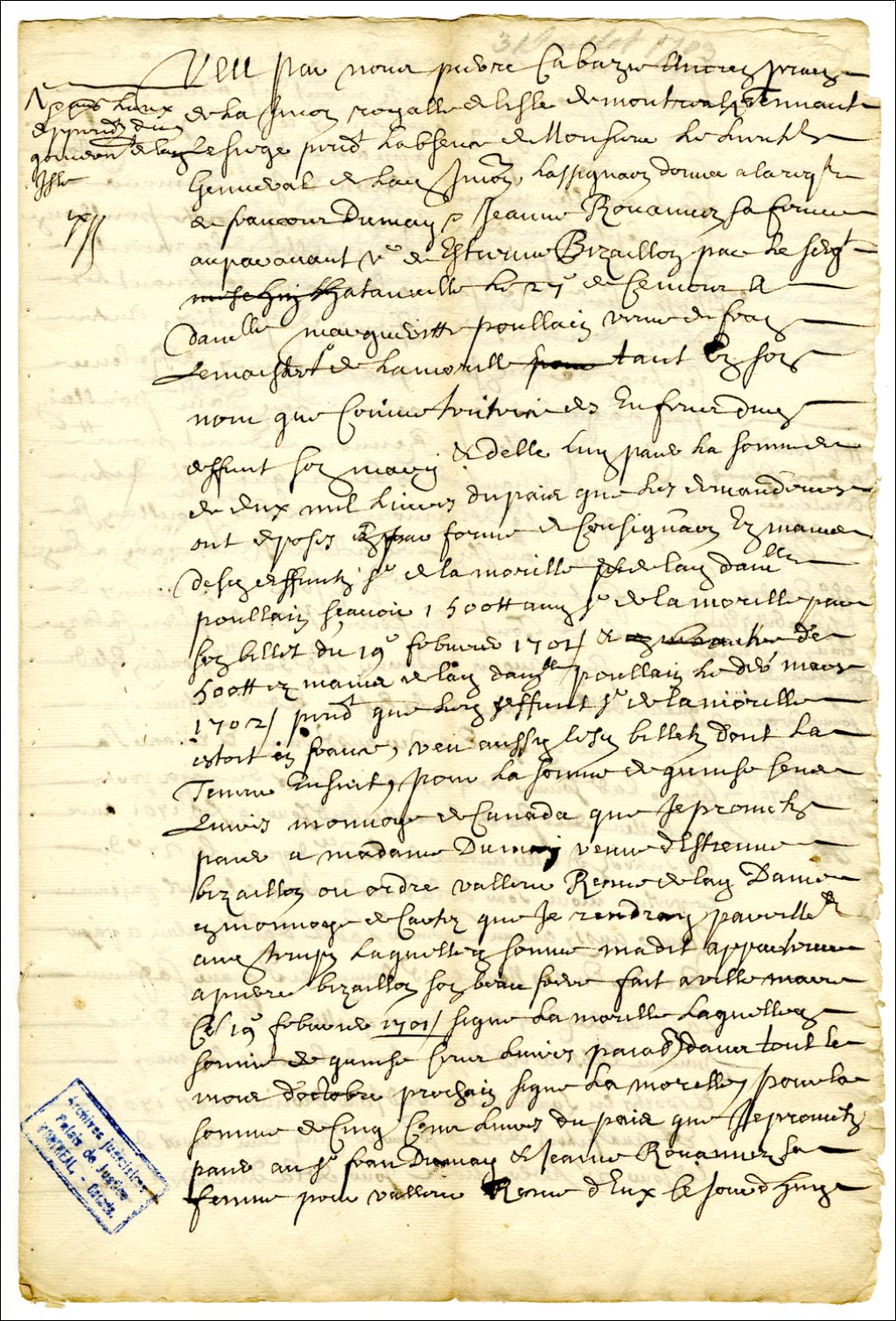 Procès entre François Dumais [Demers] et Jeanne Rouanner [Roinay, Roanes], son épouse, veuve d'Etienne Bizaillon [Bisaillon], demandeurs, et Marguerite Poulin, veuve de François Lemaitre de Lamorille, et tutrice de leurs enfants, défenderesse, 31 juillet 1703, Archives nationales à Montréal, Fonds Juridiction royale de Montréal, (06M,TL4,S1,D682A).