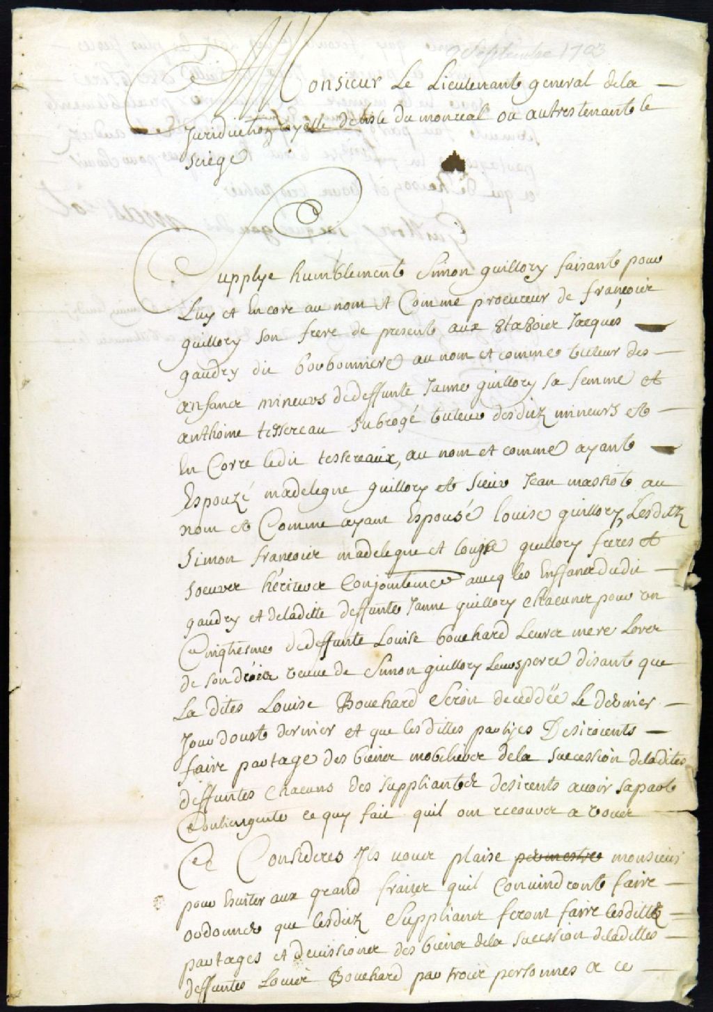 - Ce dossier d'administration judiciaire est composé des pièces suivantes : la requête de Simon Guillory, fils, comme procureur de son frère François et autres héritiers de feu Simon Guillory et Louise Bouchard, leurs parents, y compris les héritiers de feue Jeanne Guillory, sa défunte soeur, pour faire le partage de leurs biens par trois personnes et ainsi éviter les gros frais ; la permission accordée ; et les conclusions du procureur du roi concernant la distribution des biens de la succession de feue Jeanne Guillory