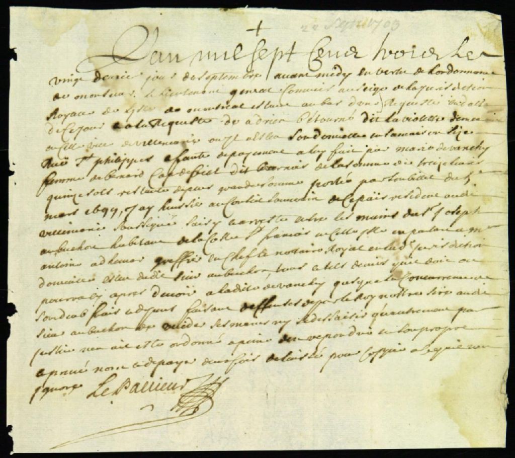Procès entre Adrien Bétourné dit Laviolette, demandeur, et Marie de Vanchy, défenderesse, pour remboursement d'une dette, 22 septembre 1703, Archives nationales à Montréal, Fonds Juridiction royale de Montréal, (06M,TL4,S1,D703).